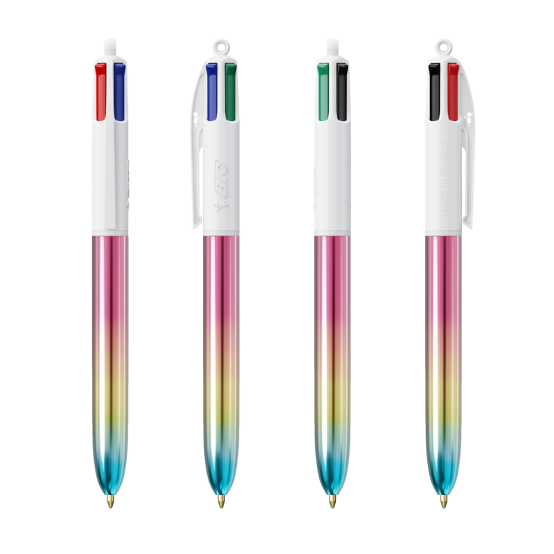 Discover our BIC® 4 Colours® Gradient! Its unique metallic gradient effect combines three shiny colours on the barrel, for Summer vibes and unlimited creativity! Our BIC® 4 Colours® ballpens have an average writing length of 8,000m (SGS tests - average writing length for blue, black, red and green cartridges). Our iconic BIC® 4 Colours® is becoming more sustainable, now with 13% less plastic in the upper part!