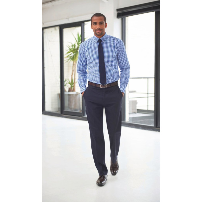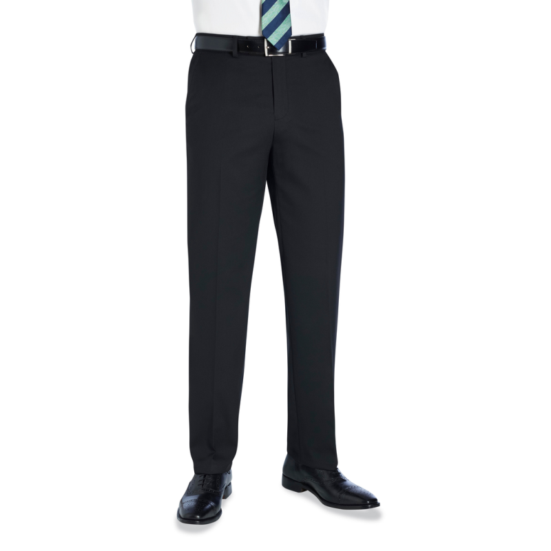Tailored fit trousers. Flat front. 2 front pockets and loops at the waist. Unfinished hem: 91.5 cm long.