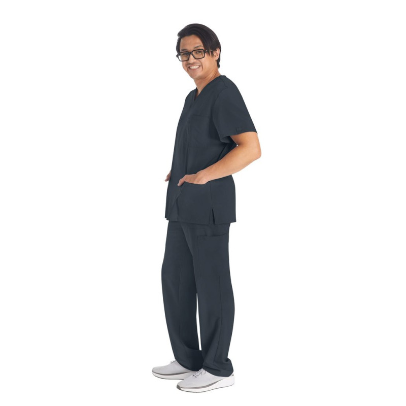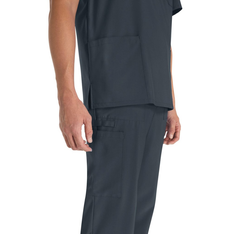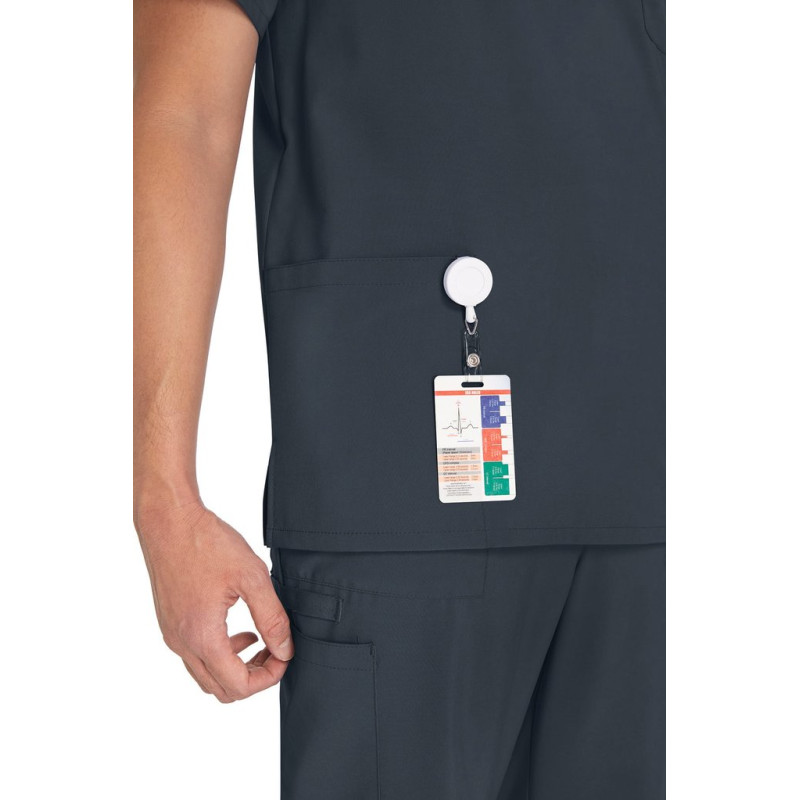 95% polyester / 5% elastane. Men's cut. Four pockets: patch pockets, chest pocket with pen slot, accessory pocket. Utility twill tape instrument loops on right pocket. Tone-on-tone signature woven label. Twill stripe with signature logo on inside collar. Side vents.