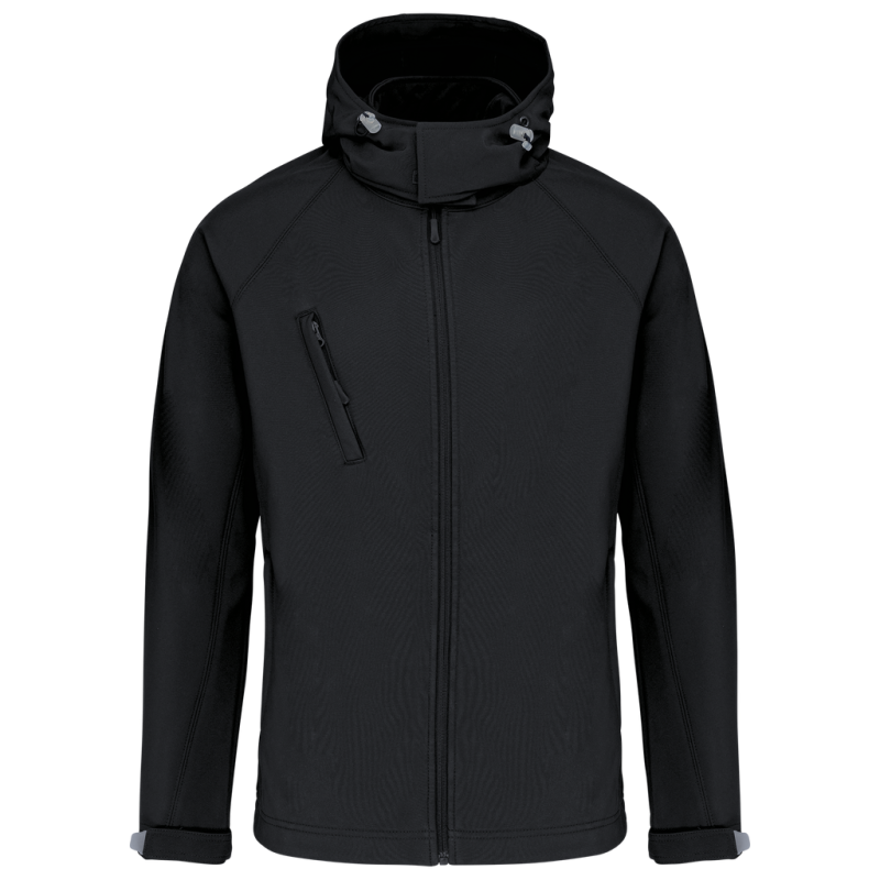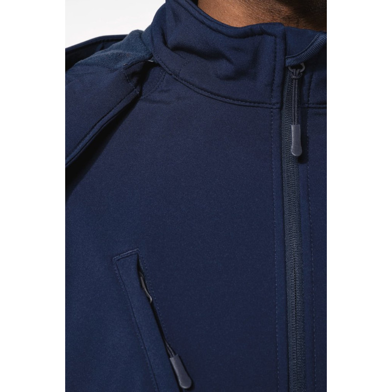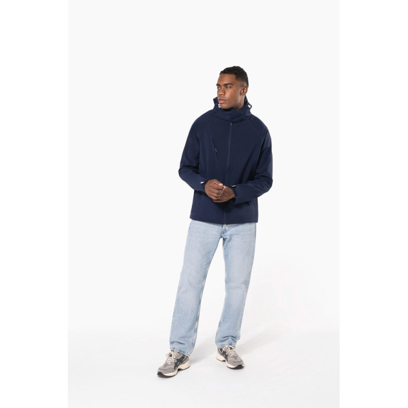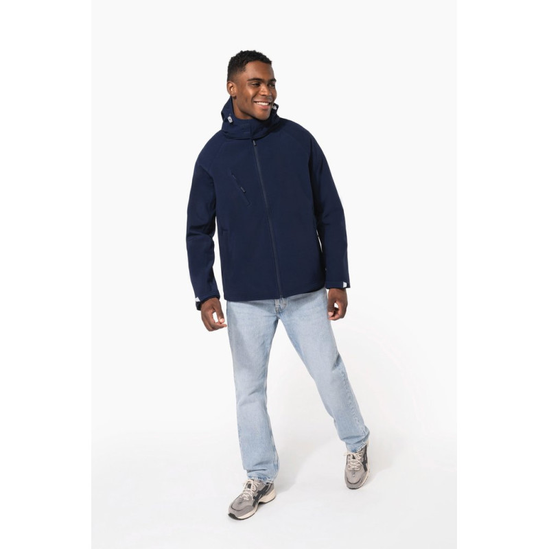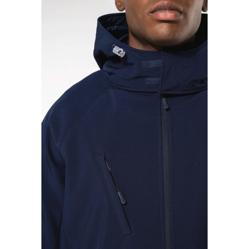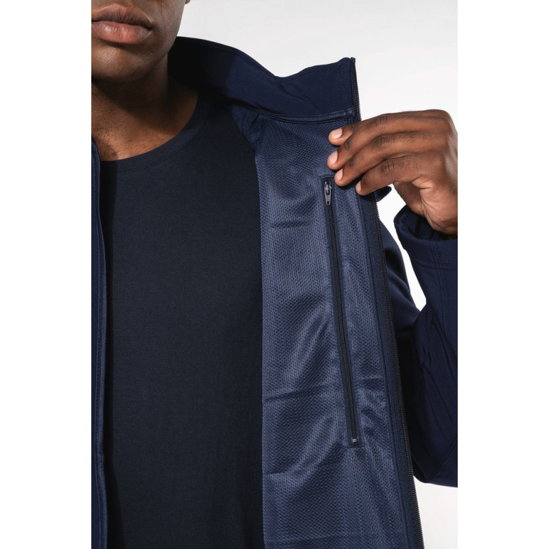 95% polyester/5% elastane. Triple-layer bonded fabric. 1000 gsm/24h breathable and 5000 mm water-resistant. Performance membrane mid layer. Anti pill micro fleece inner layer. Raglan sleeves. Zip through front. 2 front zipped pockets. 1 zipped chest pocket on right side. Detachable hood with drawcord and grip strip. Adjustable cuffs with grip strip. Invisible zip access at inner chest for decoration. Raglan sleeves.