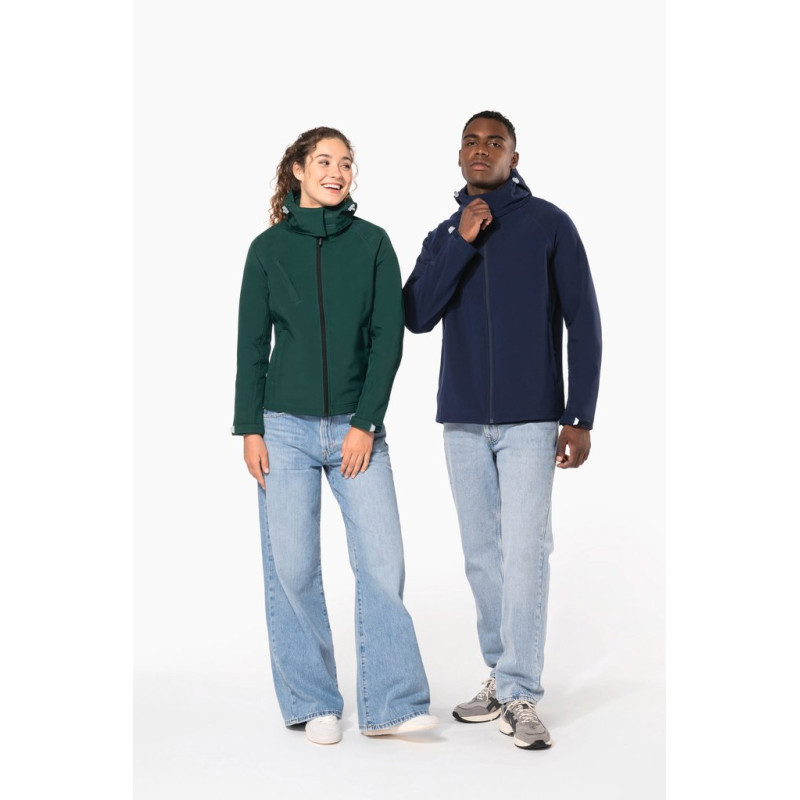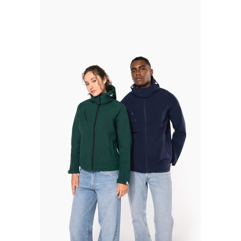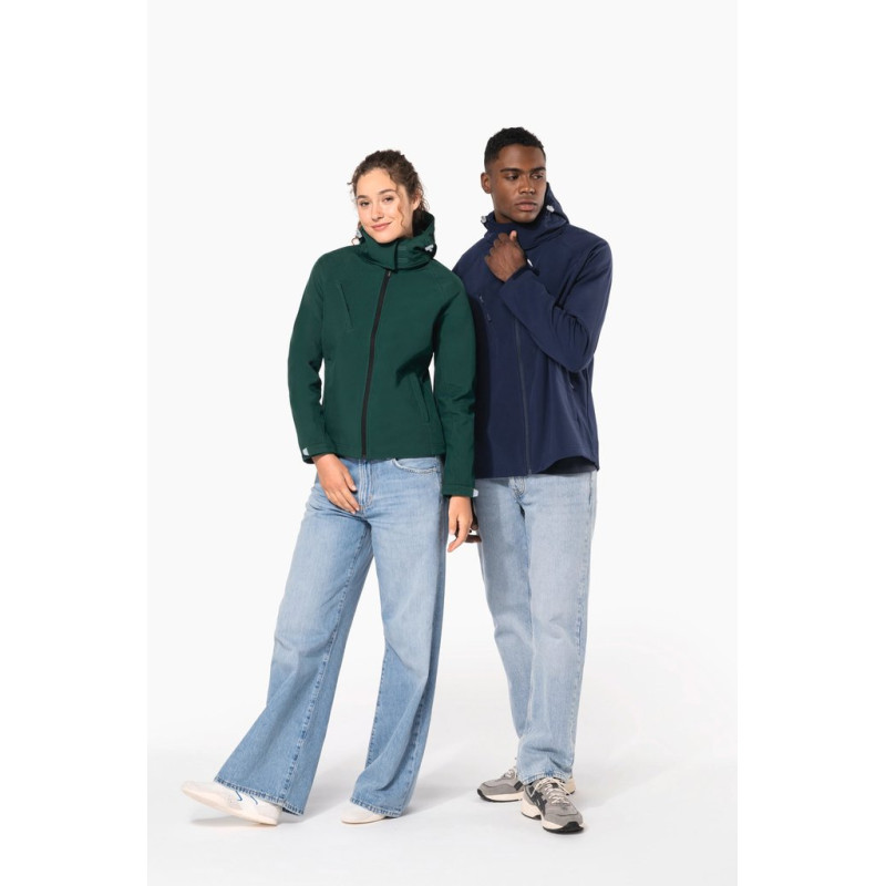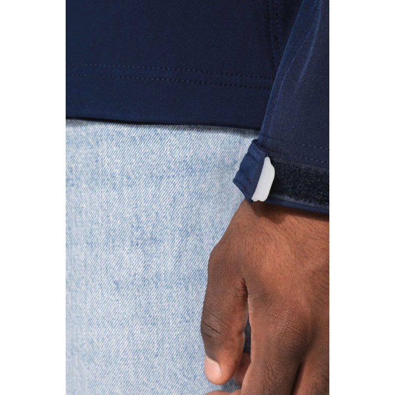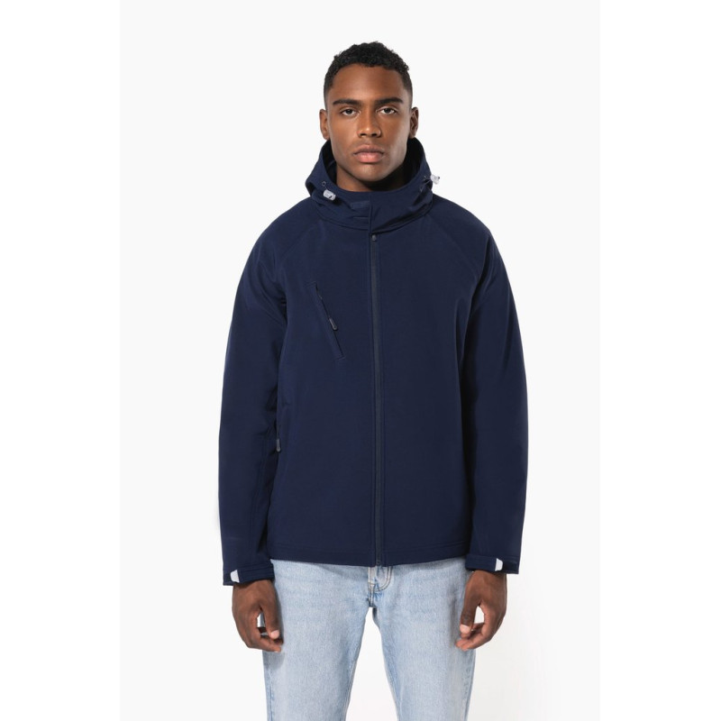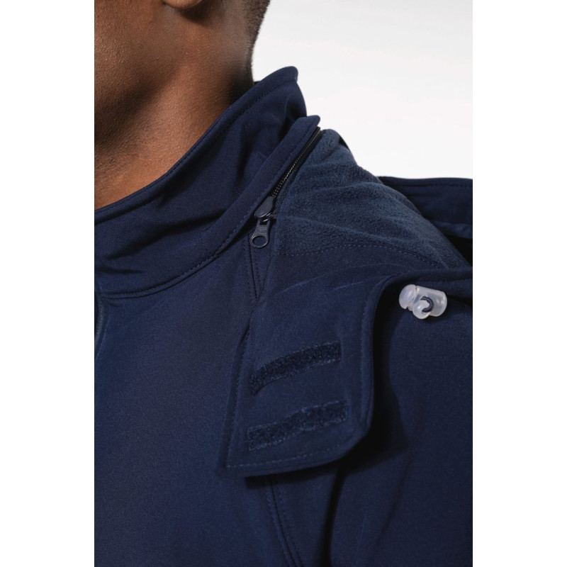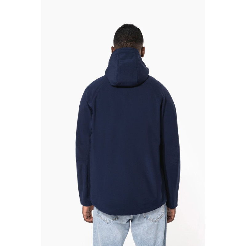95% polyester/5% elastane. Triple-layer bonded fabric. 1000 gsm/24h breathable and 5000 mm water-resistant. Performance membrane mid layer. Anti pill micro fleece inner layer. Raglan sleeves. Zip through front. 2 front zipped pockets. 1 zipped chest pocket on right side. Detachable hood with drawcord and grip strip. Adjustable cuffs with grip strip. Invisible zip access at inner chest for decoration. Raglan sleeves.