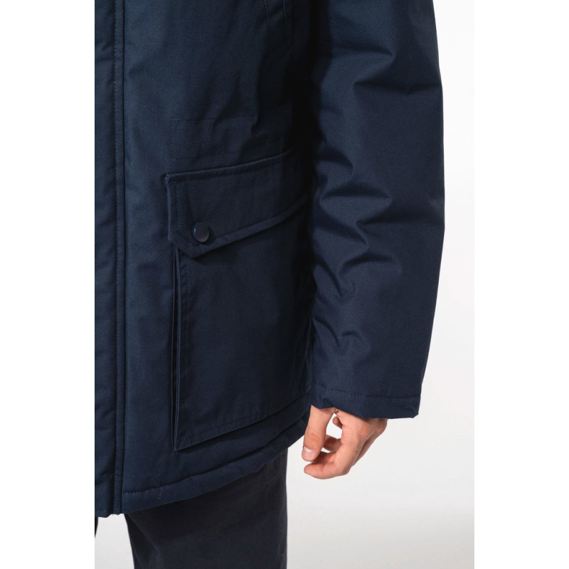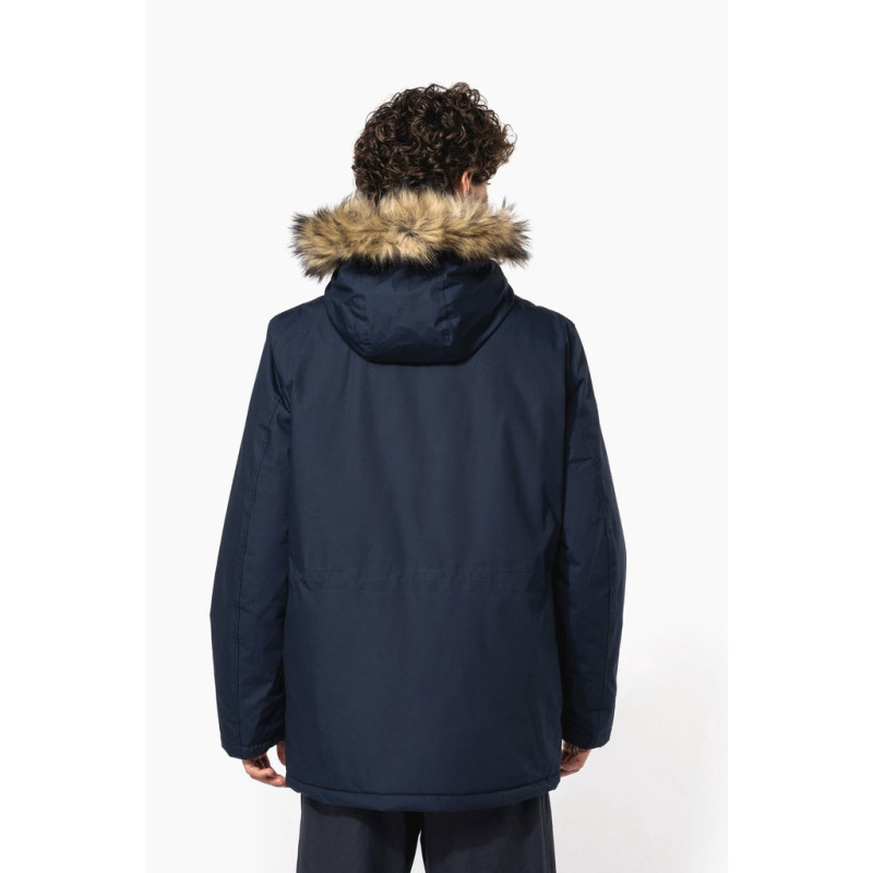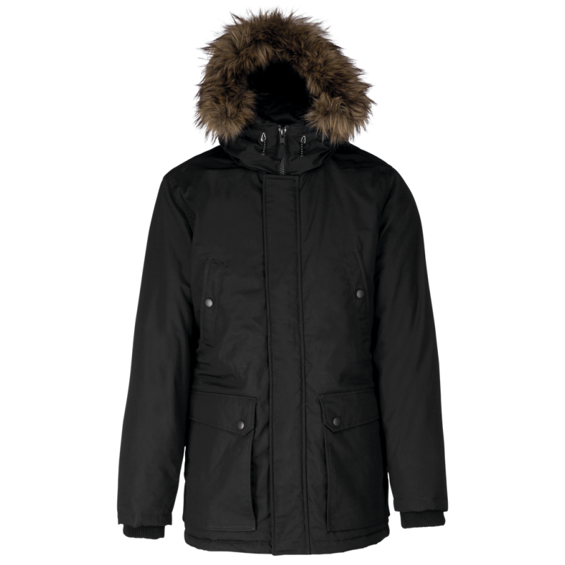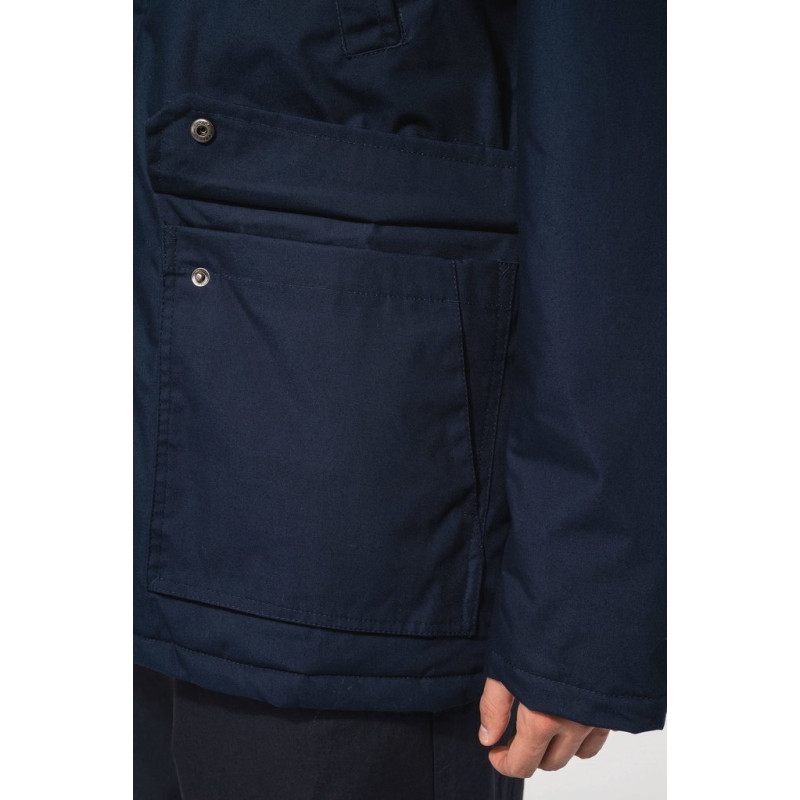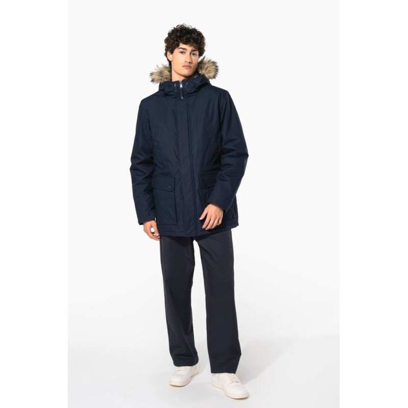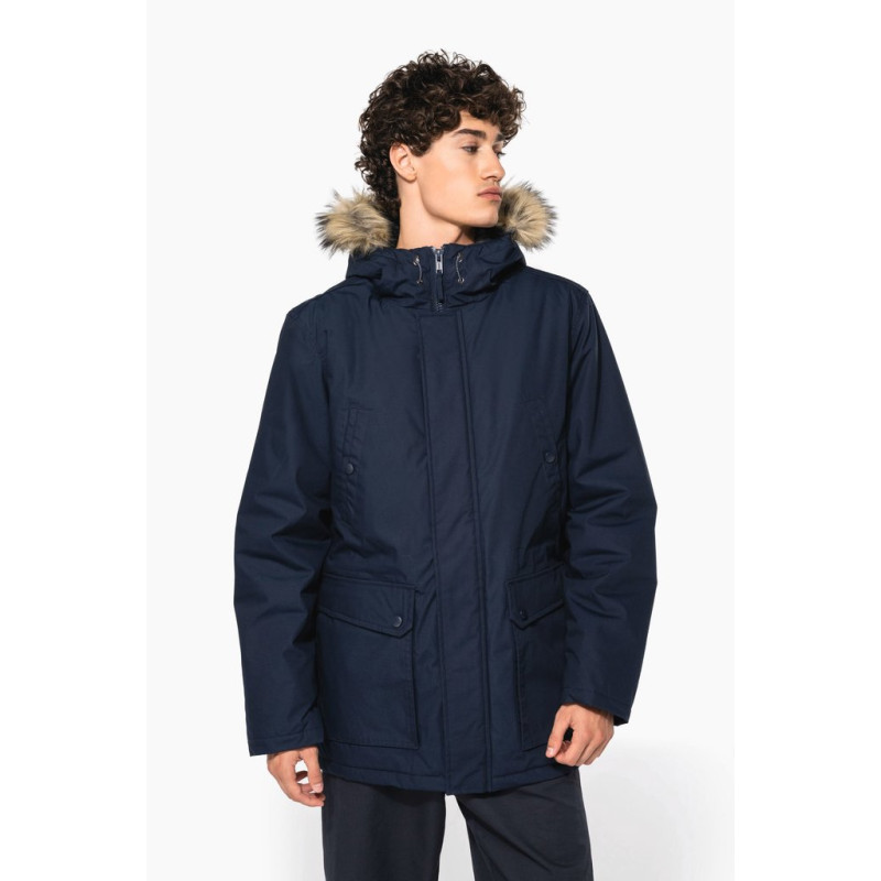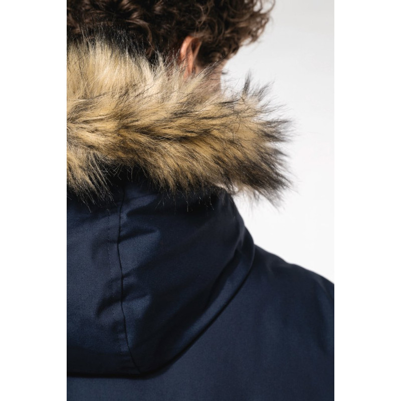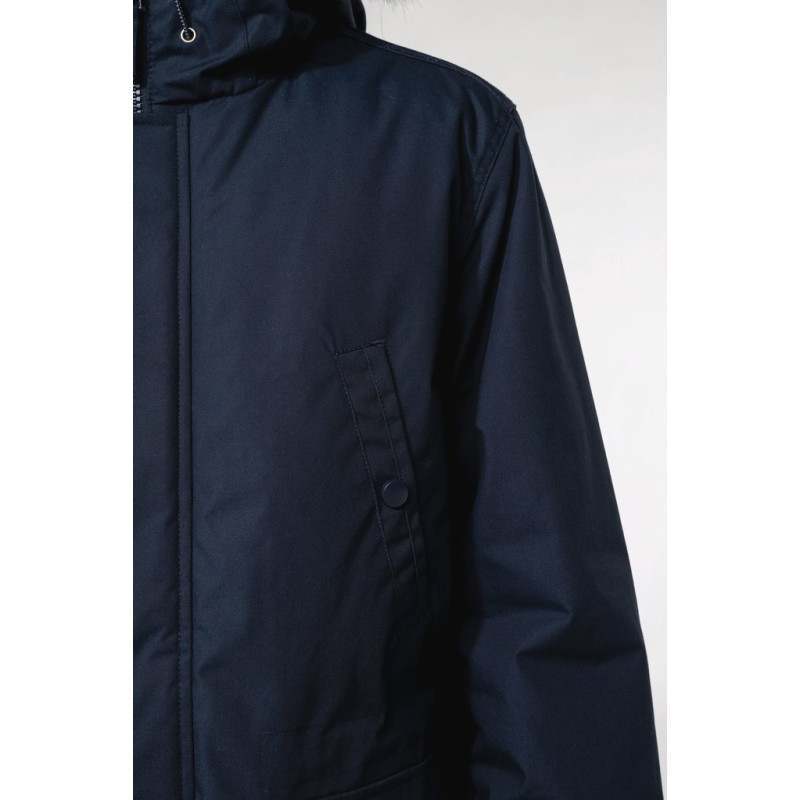 Thick canvas in 65% polyester/35% cotton. Padded lining in 100% polyester. Zip fastening concealed beneath placket and press studs. Lined and padded hood with detachable fake fur. 4 outer pockets at the front: 2 large double opening pockets with press stud flaps and 2 chest pockets with piping and press stud. 1 inner pocket with tear release fastening. Inner drawstring to adjust size. Ribbed inside cuffs. Zip at chest and zip access at hem for decoration.
