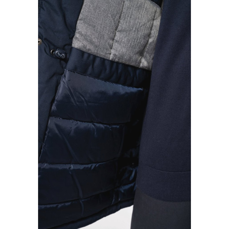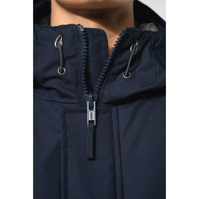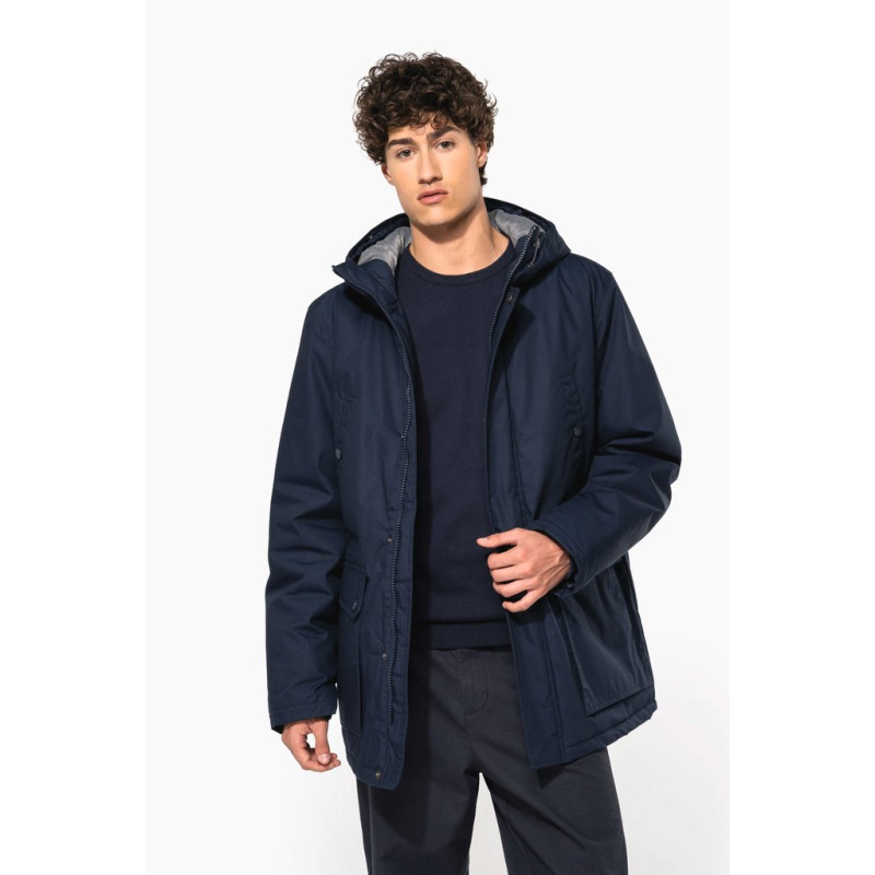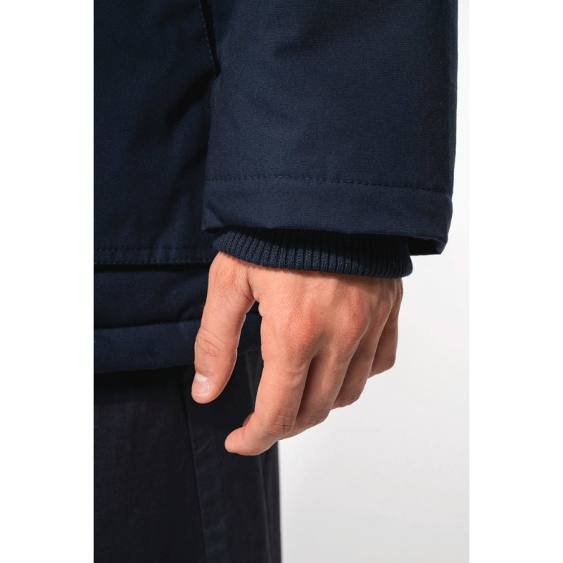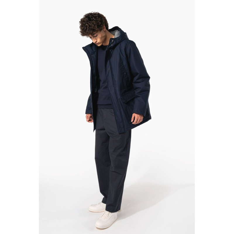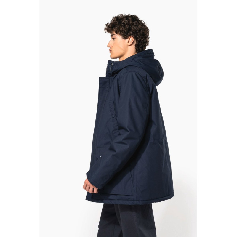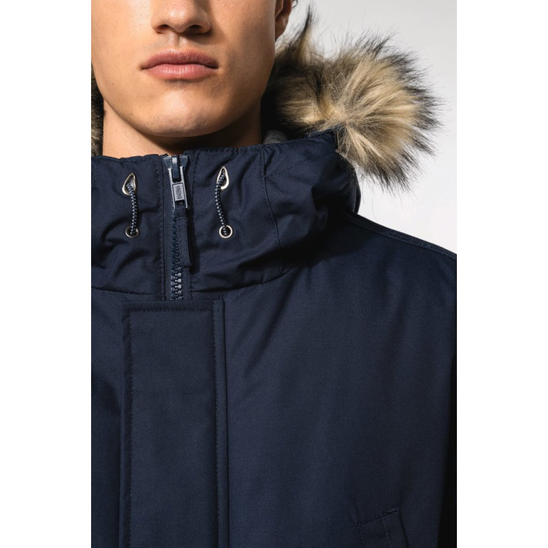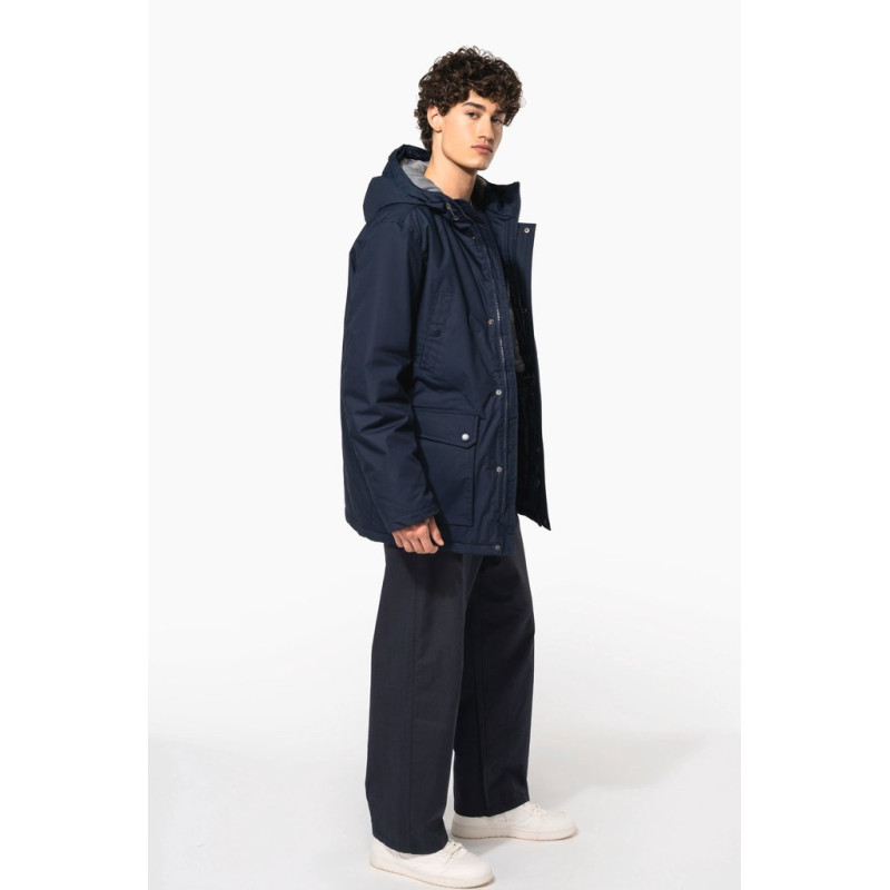 Thick canvas in 65% polyester/35% cotton. Padded lining in 100% polyester. Zip fastening concealed beneath placket and press studs. Lined and padded hood with detachable fake fur. 4 outer pockets at the front: 2 large double opening pockets with press stud flaps and 2 chest pockets with piping and press stud. 1 inner pocket with tear release fastening. Inner drawstring to adjust size. Ribbed inside cuffs. Zip at chest and zip access at hem for decoration.
