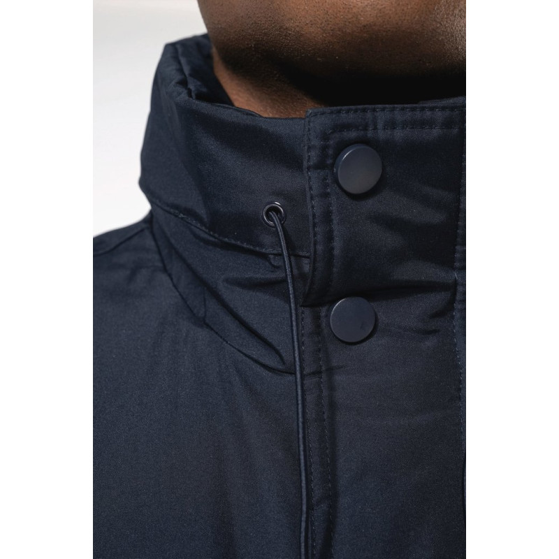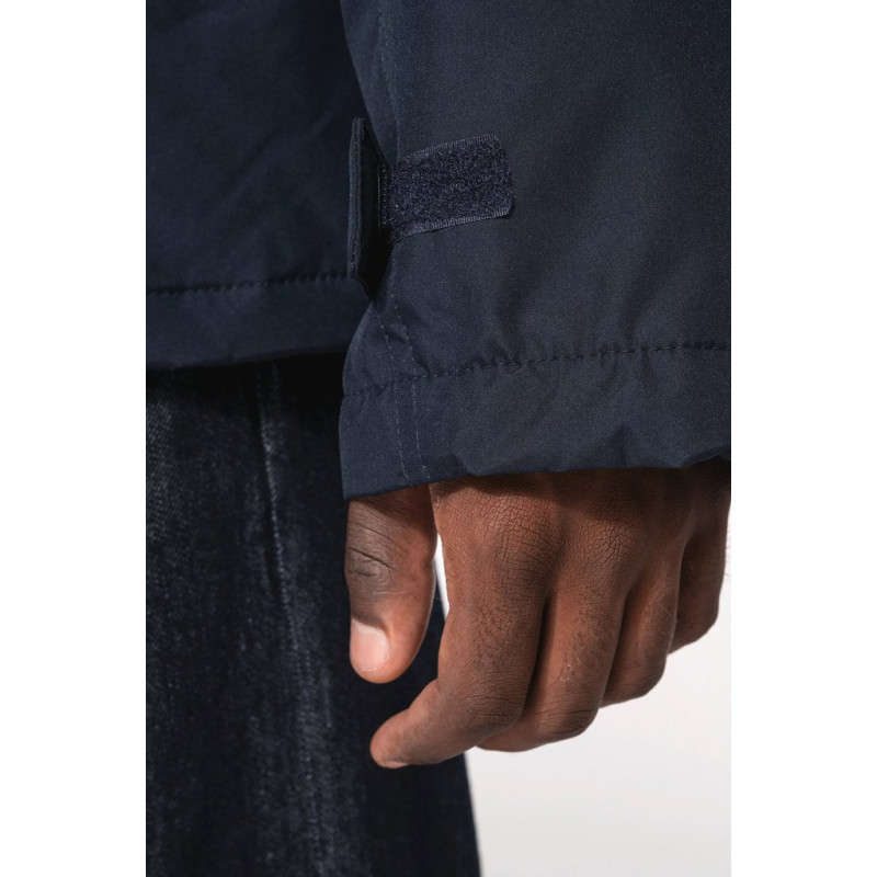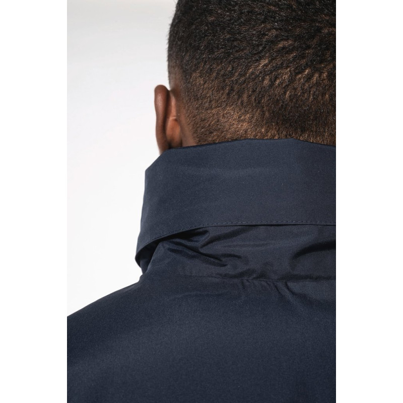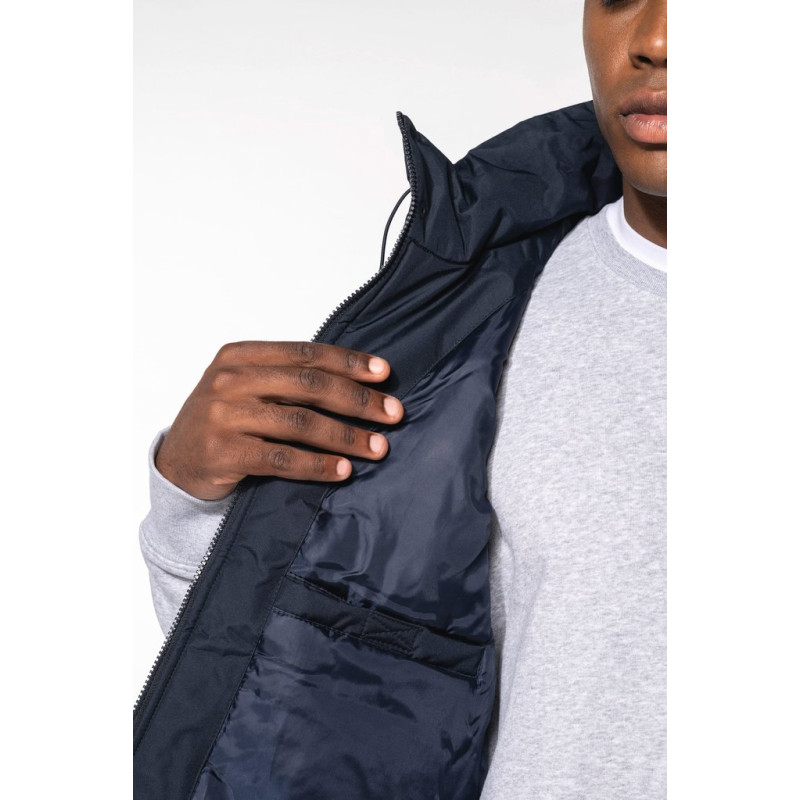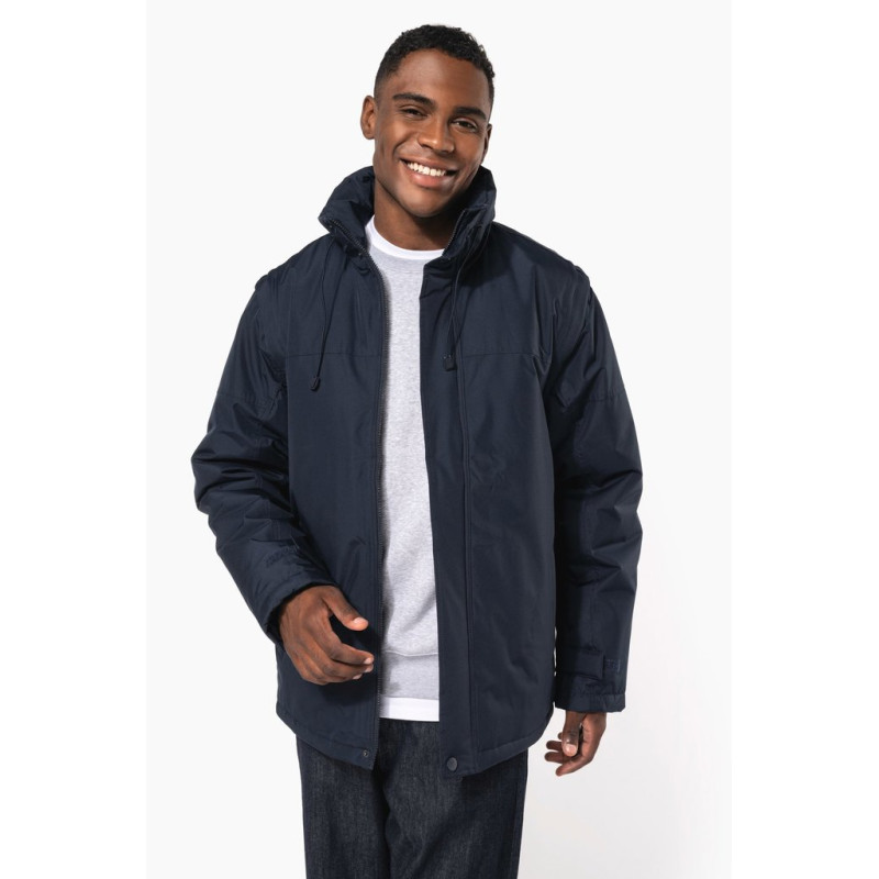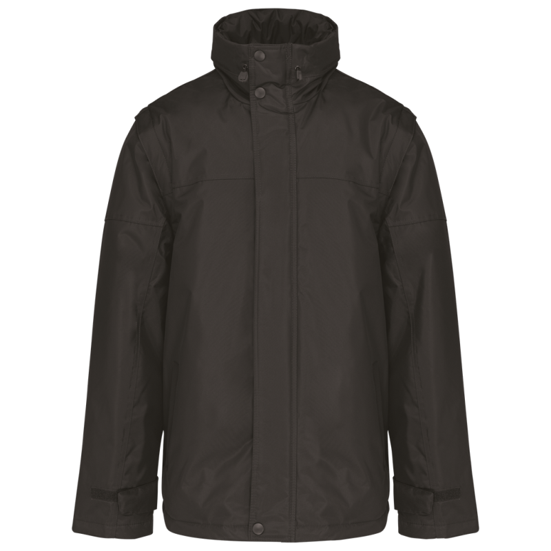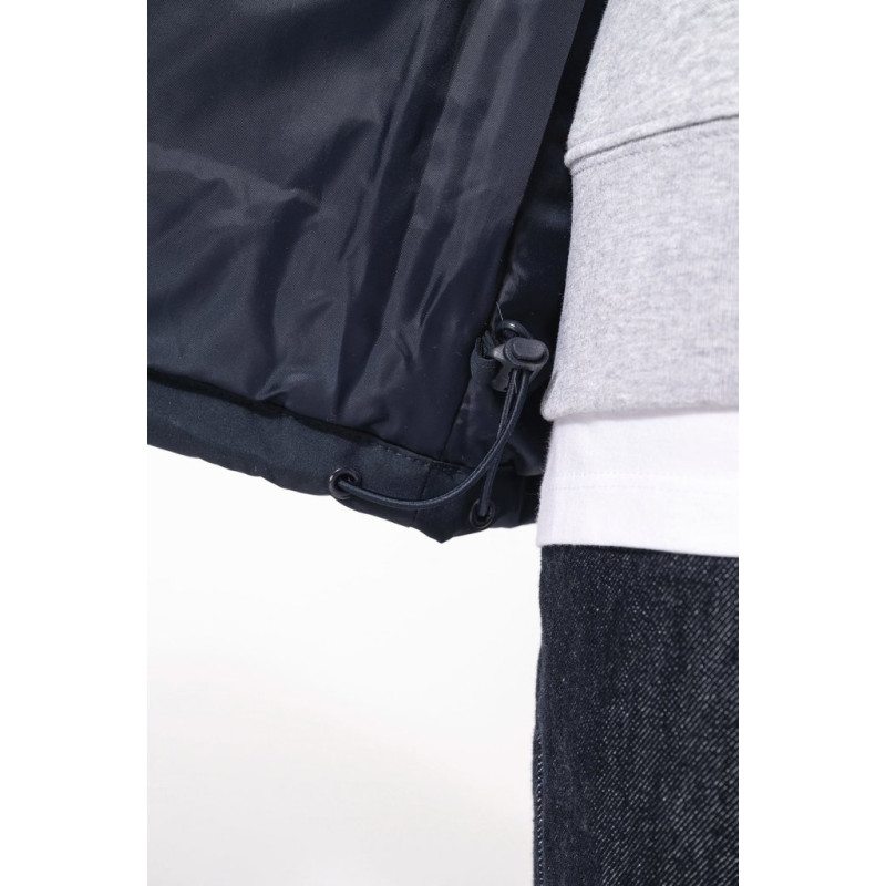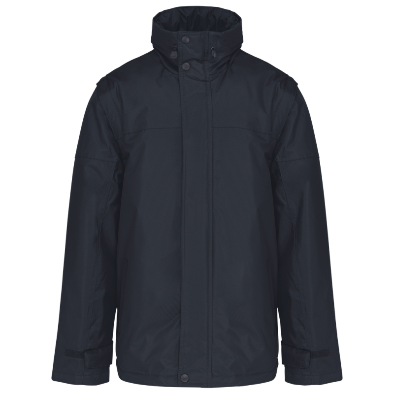 100% polyester outer with PVC coating. Polyester padding and lining. Cuff adjusters with tear release fastening. Concealed hood with elasticated drawcord and zip access. 2 inner pockets and 1 mobile phone pocket. Inner zip access for decoration. Detachable sleeves. 2 side pockets with piping. Elasticated drawcord with toggles at hem.