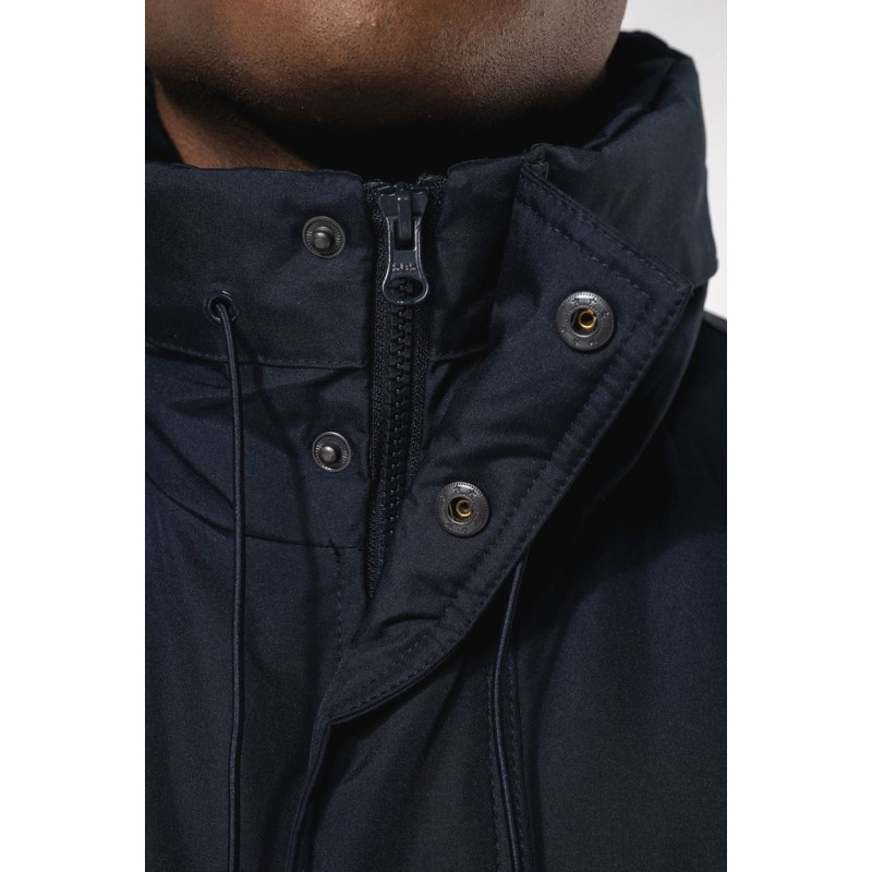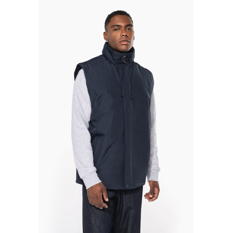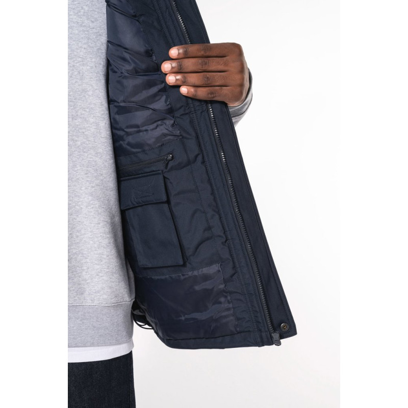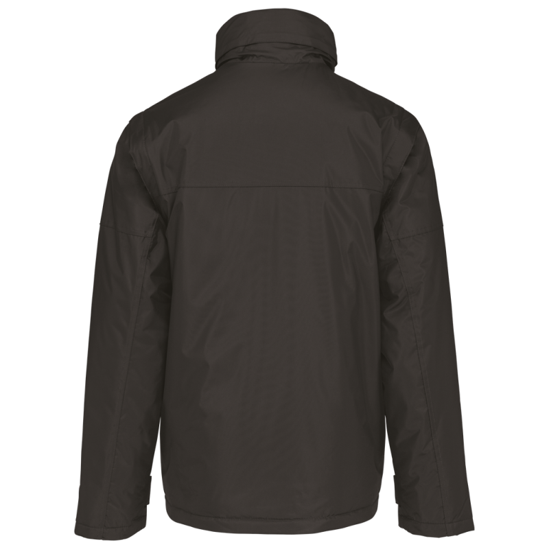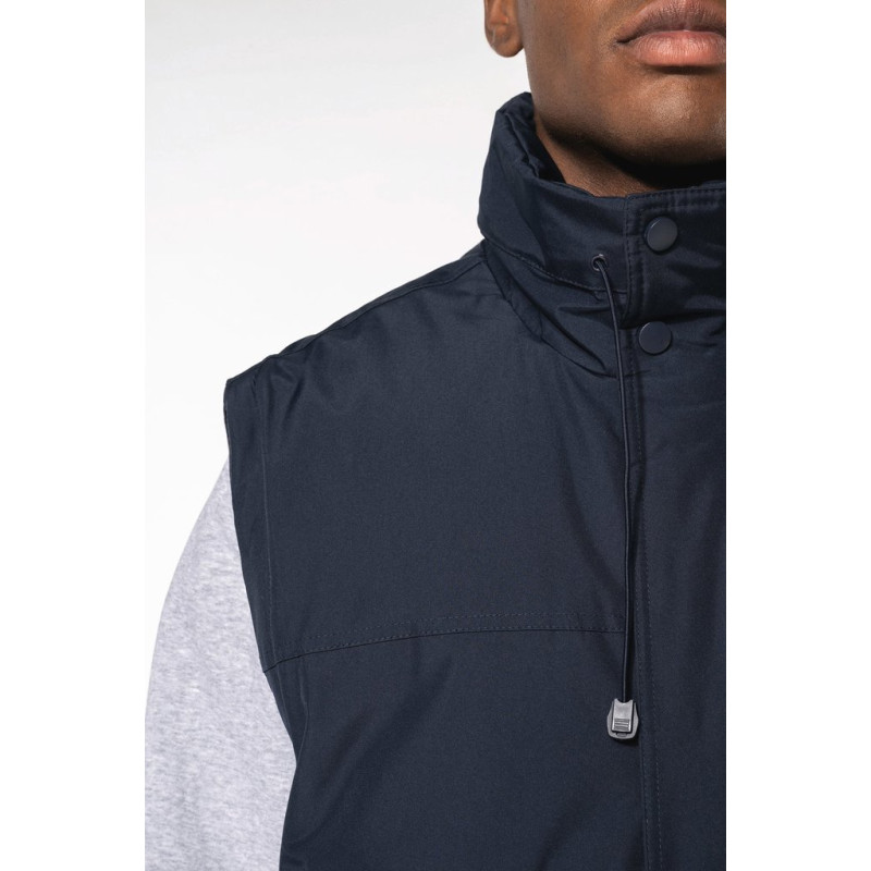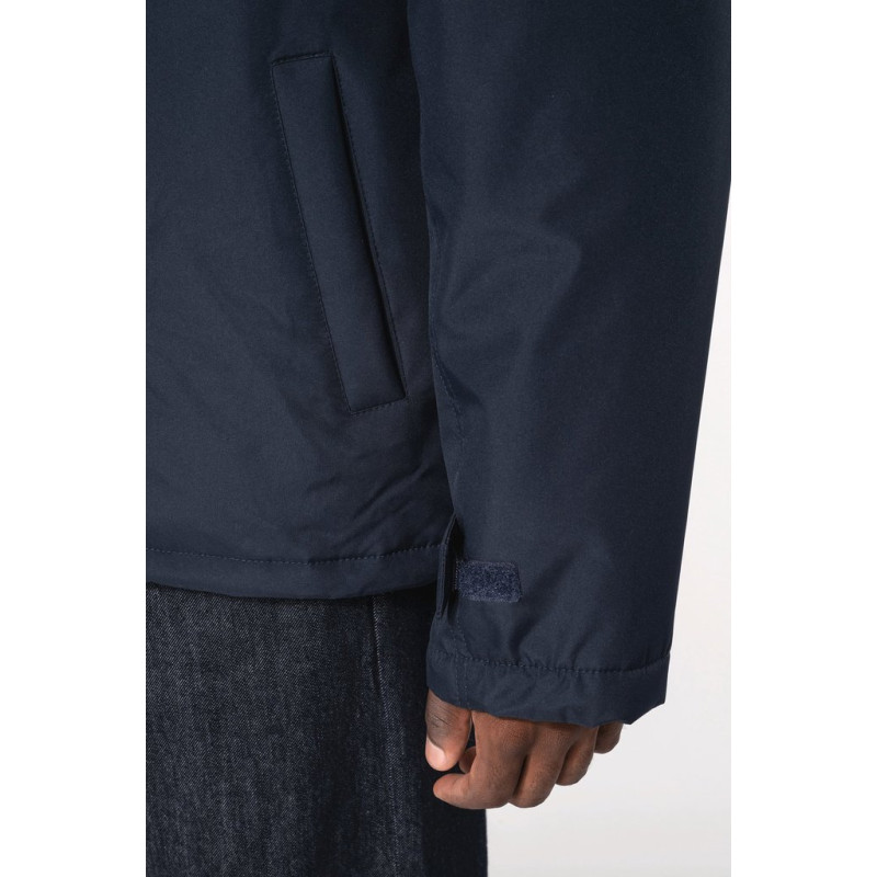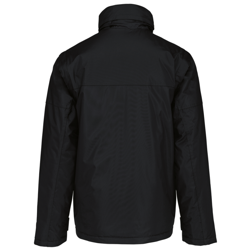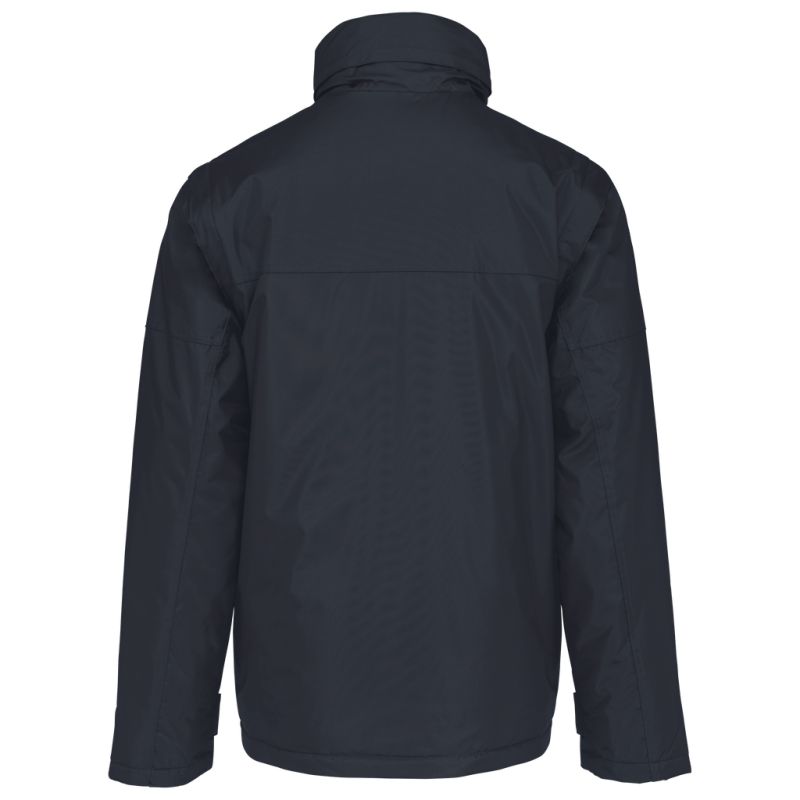 100% polyester outer with PVC coating. Polyester padding and lining. Cuff adjusters with tear release fastening. Concealed hood with elasticated drawcord and zip access. 2 inner pockets and 1 mobile phone pocket. Inner zip access for decoration. Detachable sleeves. 2 side pockets with piping. Elasticated drawcord with toggles at hem.