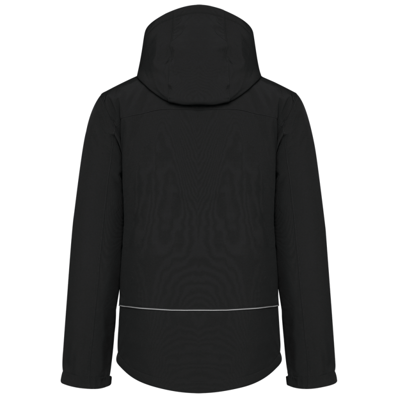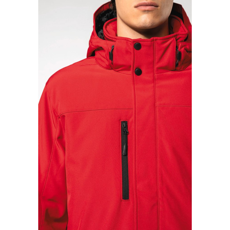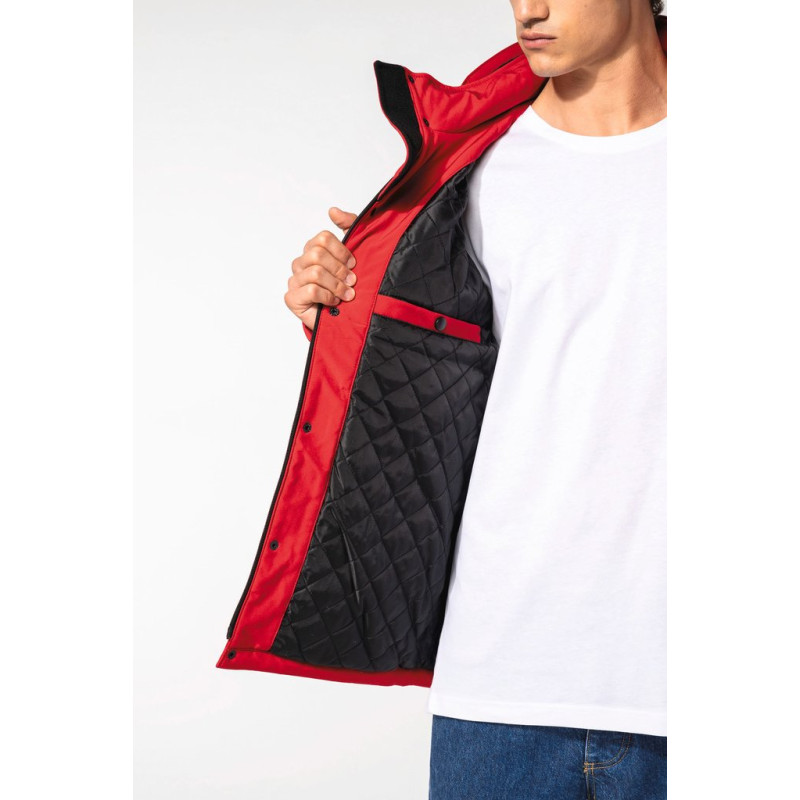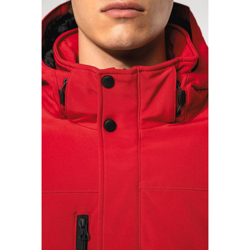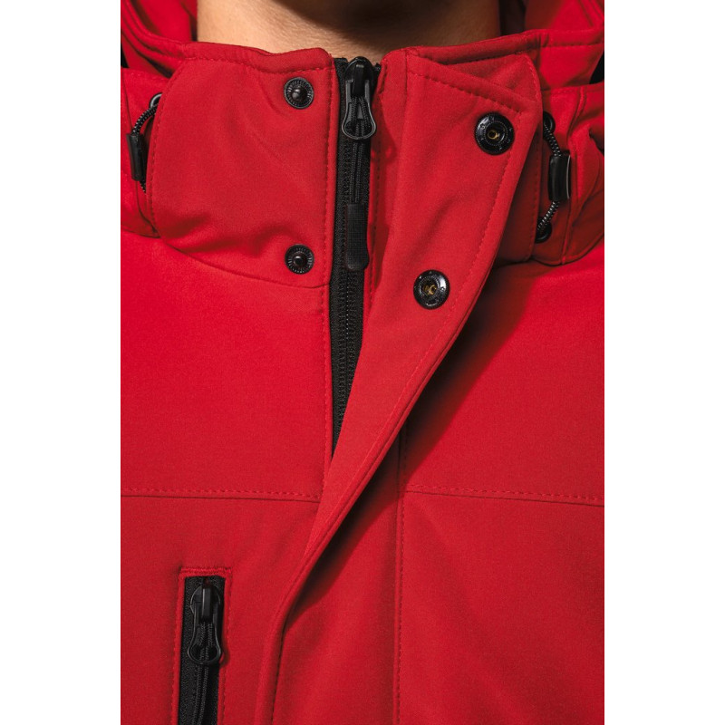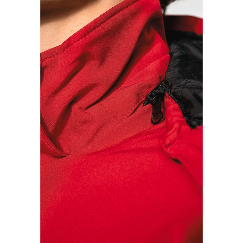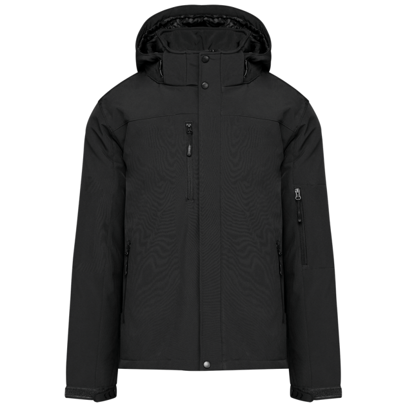 95% polyester/5% elastane. Triple-layer bonded fabric. 3000 gsm/24h breathable and 8000 mm water-resistant. Breathable membrane mid layer. Inner layer: microfleece. 100 % polyester quilted lining. Front: 4 zipped pockets (2 side, 1 sleeve, 1 right chest). 2 inner pockets with press studs. Removable 3-panel hood, lined and quilted, adjustable with stoppers. Adjustable cuff with tear release fastening. 1 zip at chest and 1 zip at hem for decoration access.