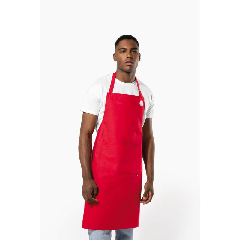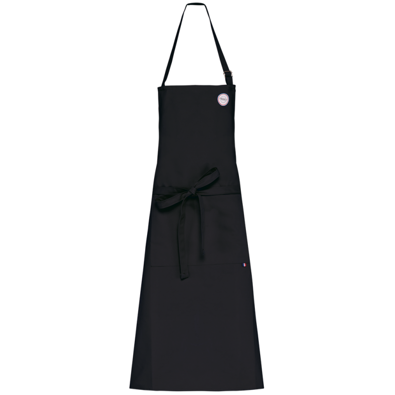 100% cotton. Domestic washing at 60°C. Length of apron can be adjusted by a metal buckle at neck level. Woven French flag label on front pocket. Product certified "Origine France Garantie", made in Brittany (label applied as a sticker).
