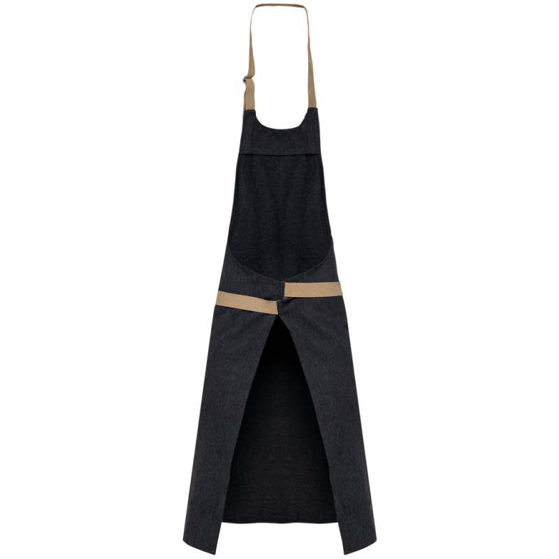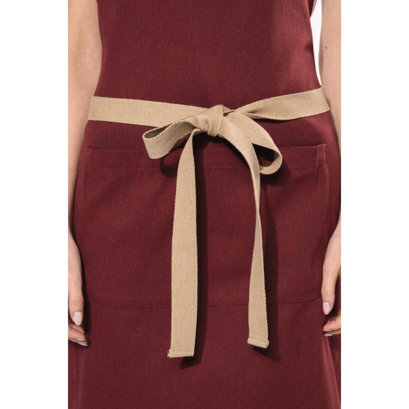 Fabric made from recycled cotton pré-consumer and polyester post-consumer. 73% cotton/27% polyester for Hemp and Rosewood colourways. 73% cotton / 25% polyester /2% other fibres for Ecume colourway. 73% cotton / 27% polyester for Carbon. 65% cotton/35% polyester for the Meadow Green colourway. Domestic washing at 60°C. Metal buckle at the neck to adjust apron length. Large front pocket with two compartments. Waist and neckline strap in recycled cotton, Hemp colourway for all colours. Dimensions: H 90 cm x L 76 cm. Pocket: H 20 cm x L 31.5 cm. Created using a recycling process, fabric may show slight variations in colour and composition may vary from item to item, making each piece unique.