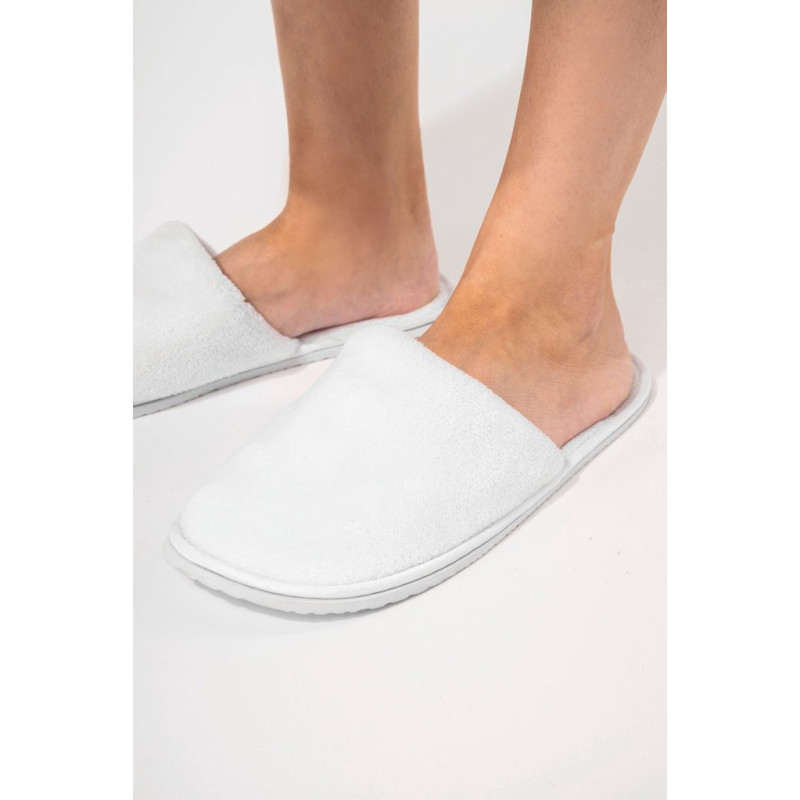 100% polyester. Towelling knit fabric. Non-slip EVA sole. Padded insole at heel. Bias finish. Closed-toe mules.