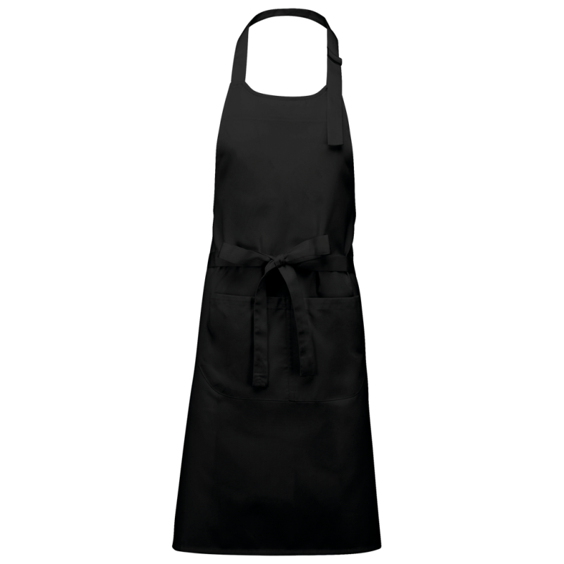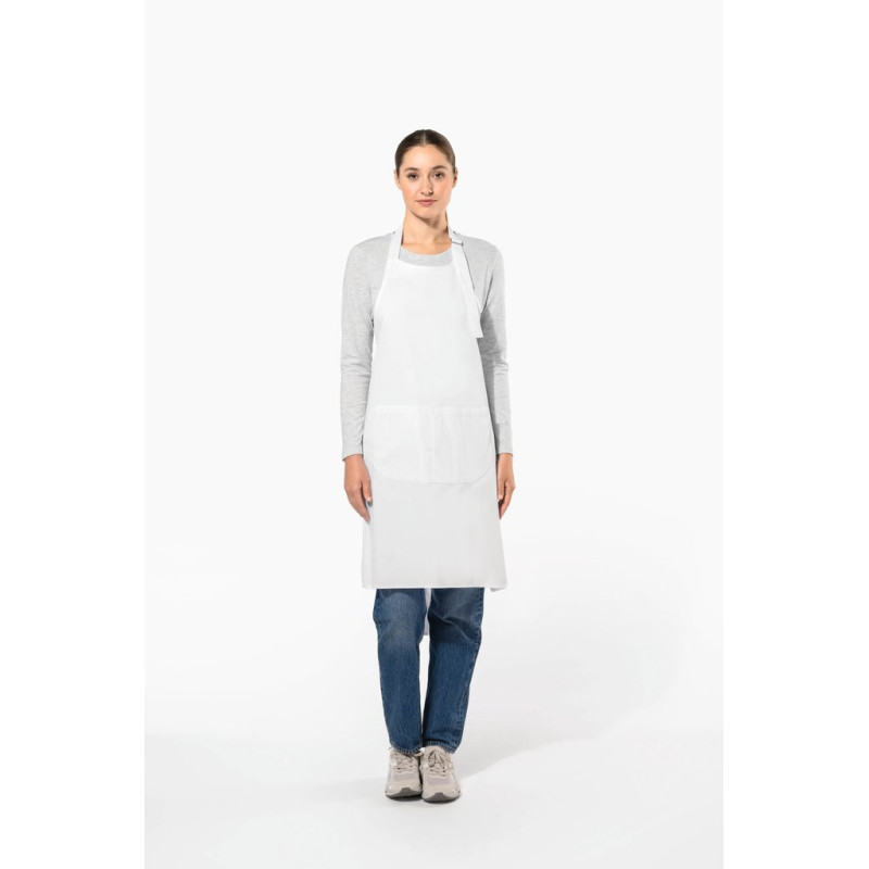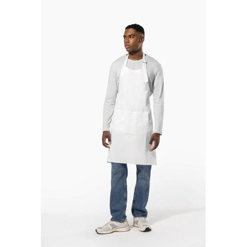 65% polyester / 35% cotton. Domestic washing at 60°C. Industrial washing at 75°C in accordance with ISO 15797 requirement standards. Neck tie with metal buckle to adjust the length of the apron. Large front pocket with two compartments. Apron : Length 90 cm - Width 76 cm. Pocket: Length 20 cm - Width 31.5 cm.