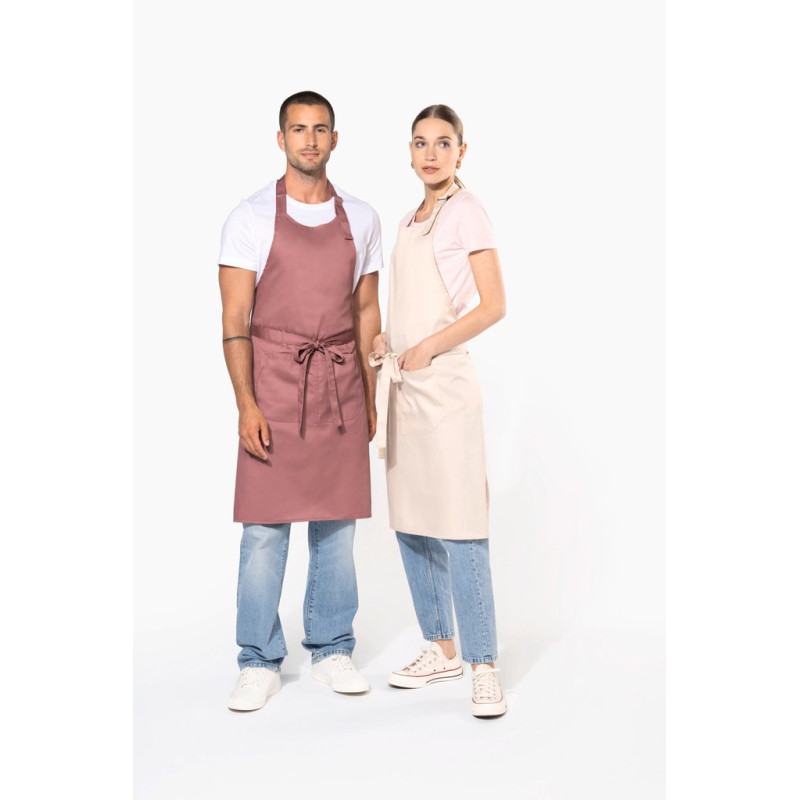65% polyester/35% cotton (Denim, Black Denim 65 % cotton / 35 % polyester). Domestic wash 60°C. Adjustable neck tie with sliding metal buckle. Large double pocket with two compartments. Pocket: Length 20 cm - Width 31.5 cm. Apron : Length 90 cm - Width 76 cm. Denim colours : this product has been specially treated and appears intentionally aged. This manufacturing process results in colour variations between products and makes each piece unique.