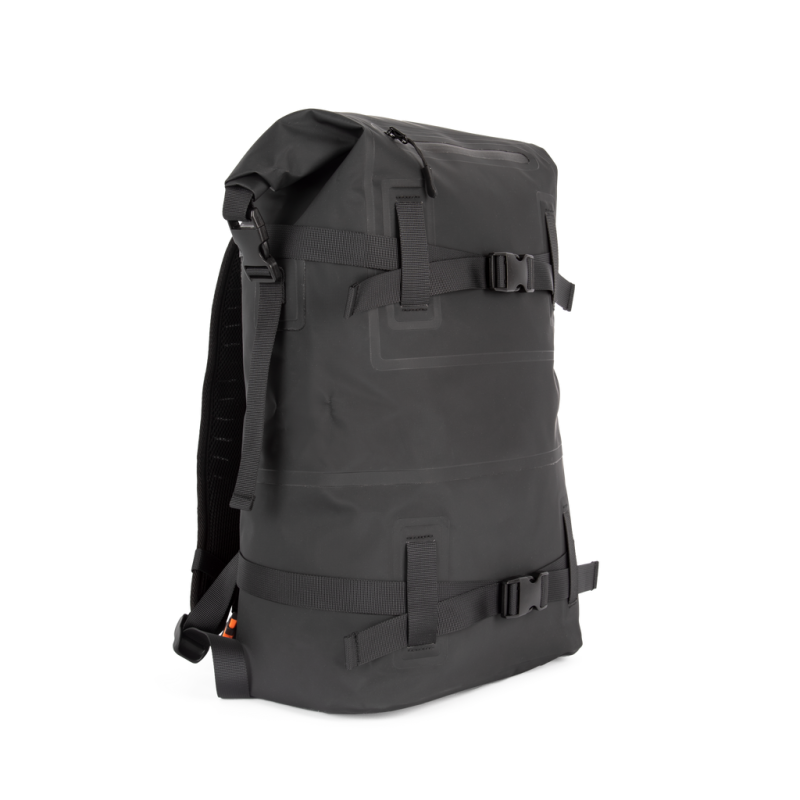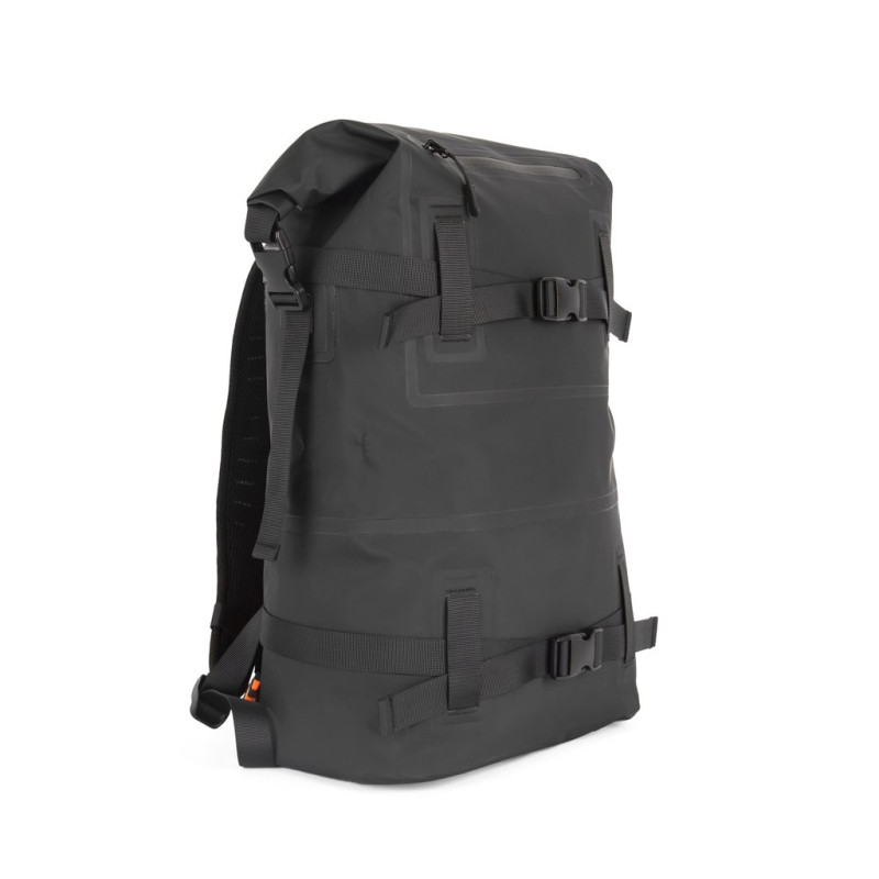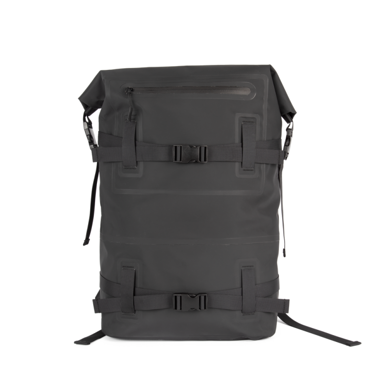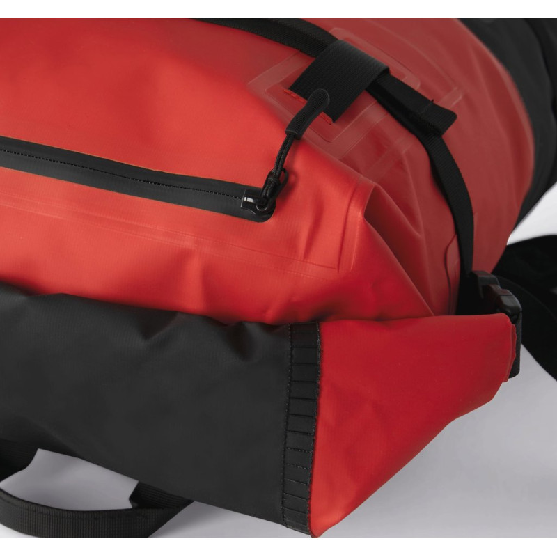 100% polyester. 100% waterproof backpack with compression straps to stabilise the contents. Roll-top fastening system. Front pocket with zip, 100% waterproof. Comfortable and breathable straps. Safety whistle integrated in the chest strap. Ideal for water sports or motorcycling.
