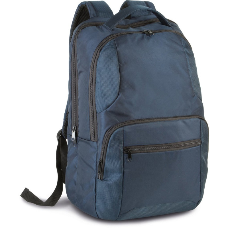 1680D polyester backpack with contrast polyester jacquard inserts. Padded compartment for laptops up to 15 inches. Main compartment for documents, with tablet sleeve and inner zipped pocket. 2 front zipped pockets. Padded back with ergonomic padded shoulder straps. Back with trolley sleeve to slip over a suitcase handle.