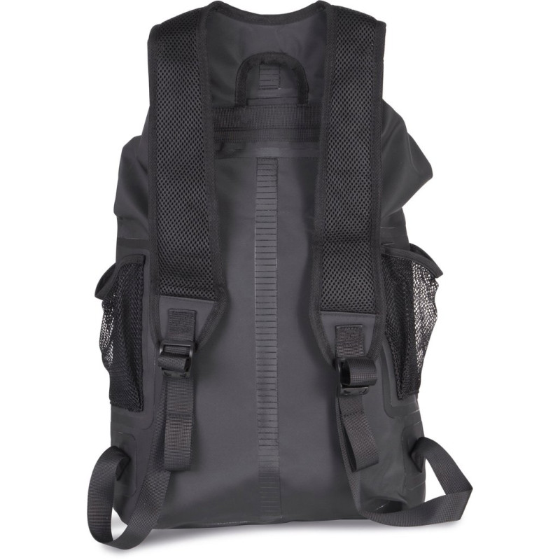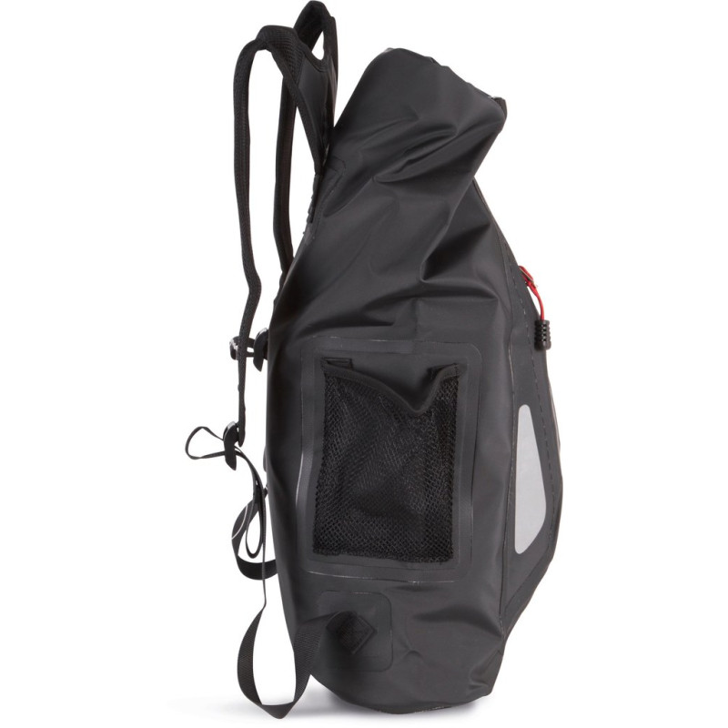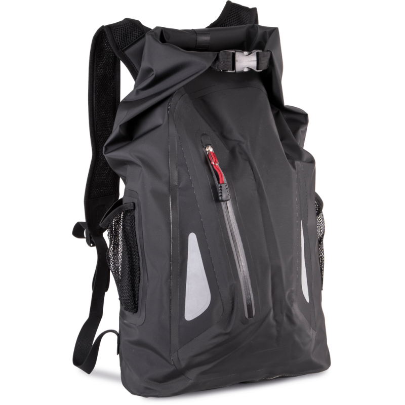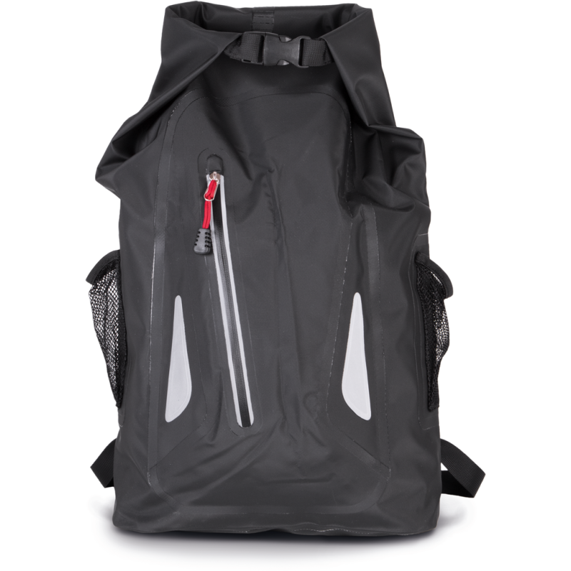Polyvinyl (PVC) tarpaulin waterproof holdall bag. Rolltop fastening system. Front pocket with 100% waterproof zip. Breathable shoulder staps. Side mesh pocket. Ideal for use at sea, for watersports or during motorbike rides.
