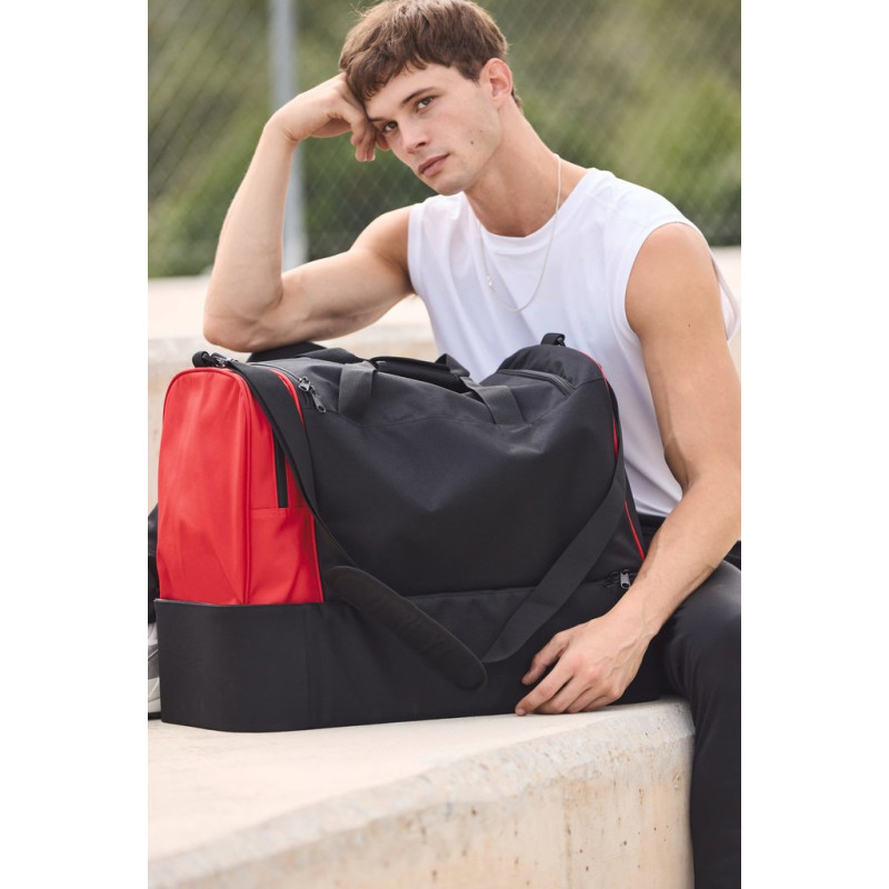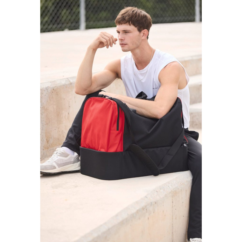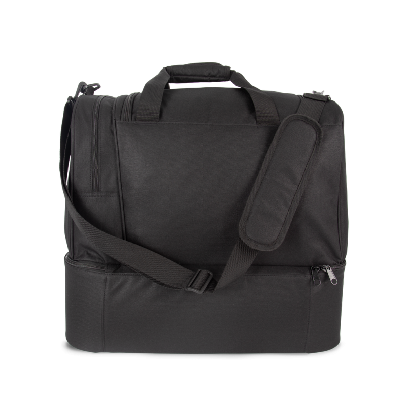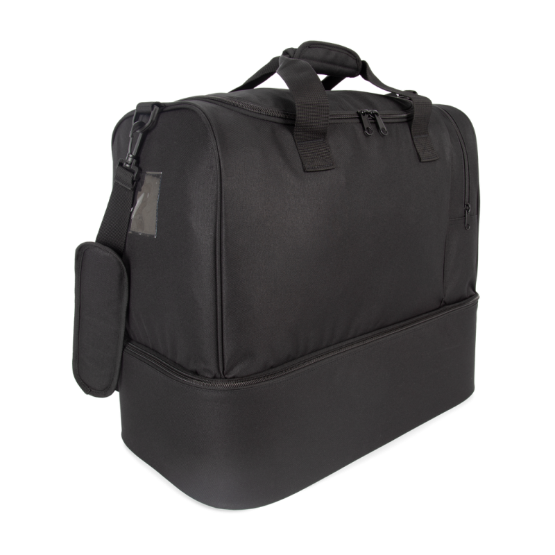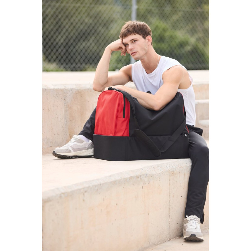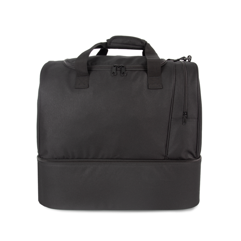 100% polyester. Large side compartment with contrasting zip. Large main compartment with full top opening and double zip closure. Padded handles for optimum comfort. Rigid base: the rigid panel on the inside of the lining can be removed via an internal zip, allowing the panel to be customised and the bag to be machine-washed. Available in sizes M and L, for junior and senior teams.