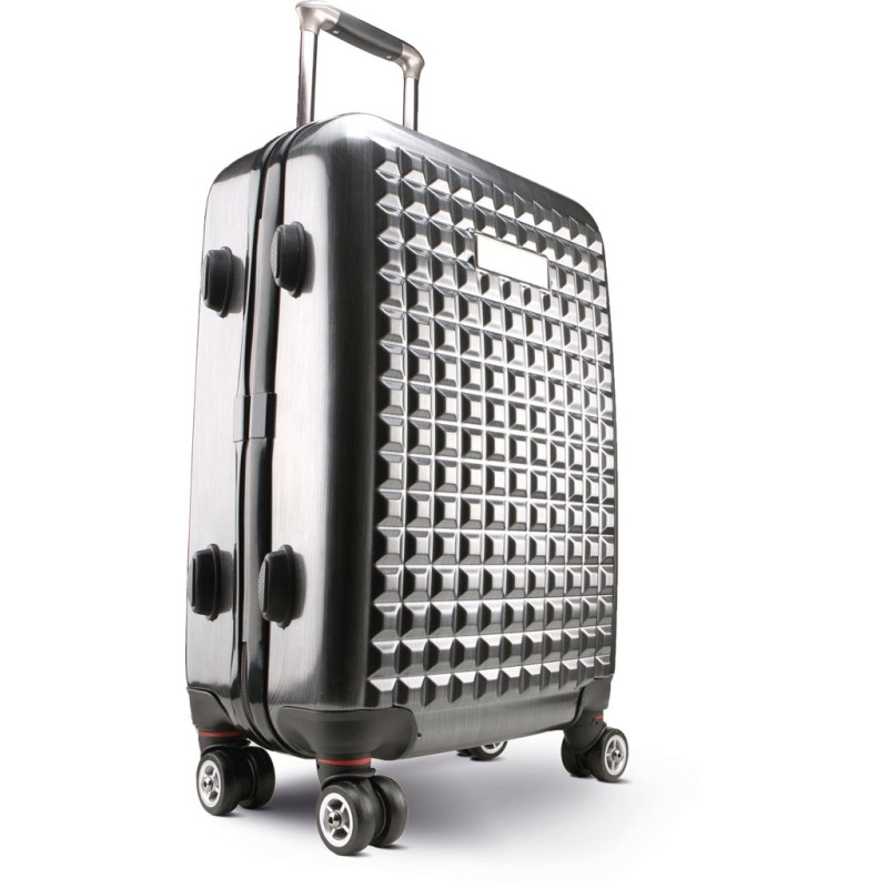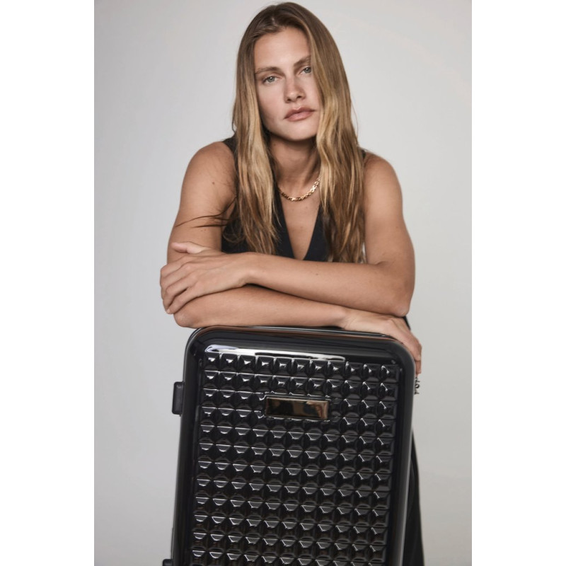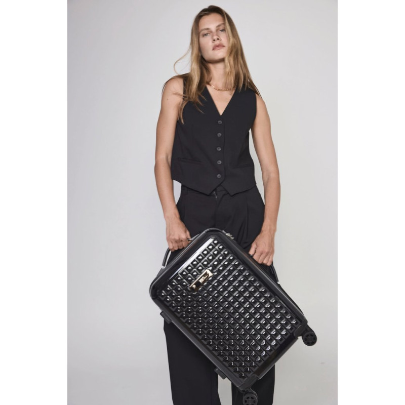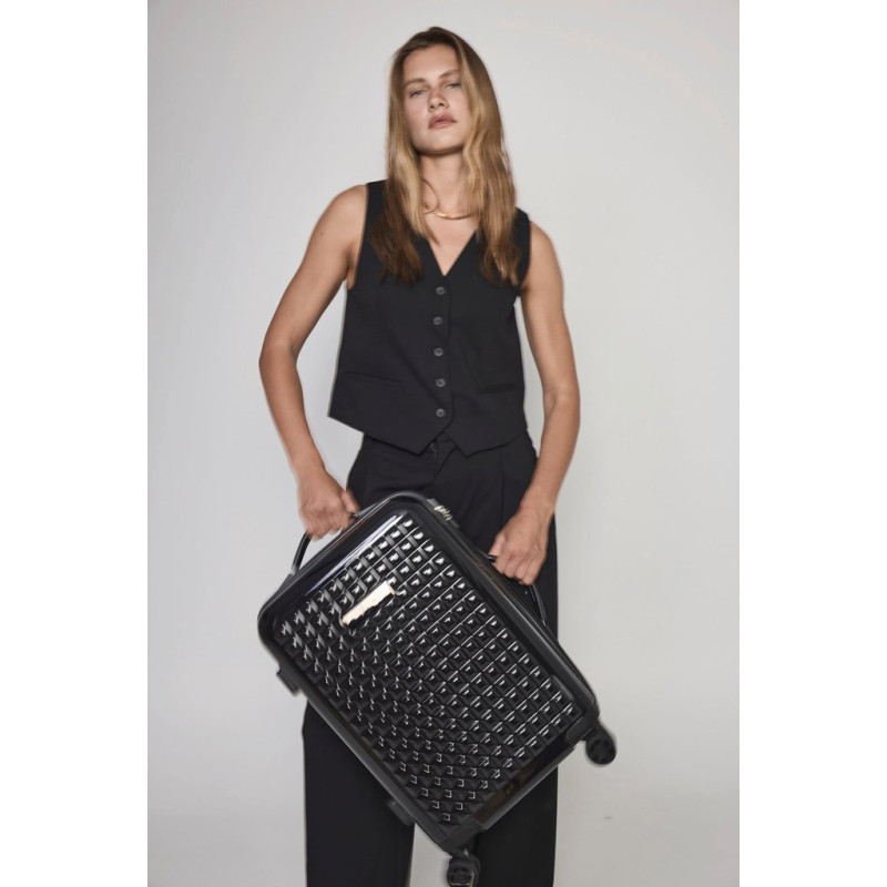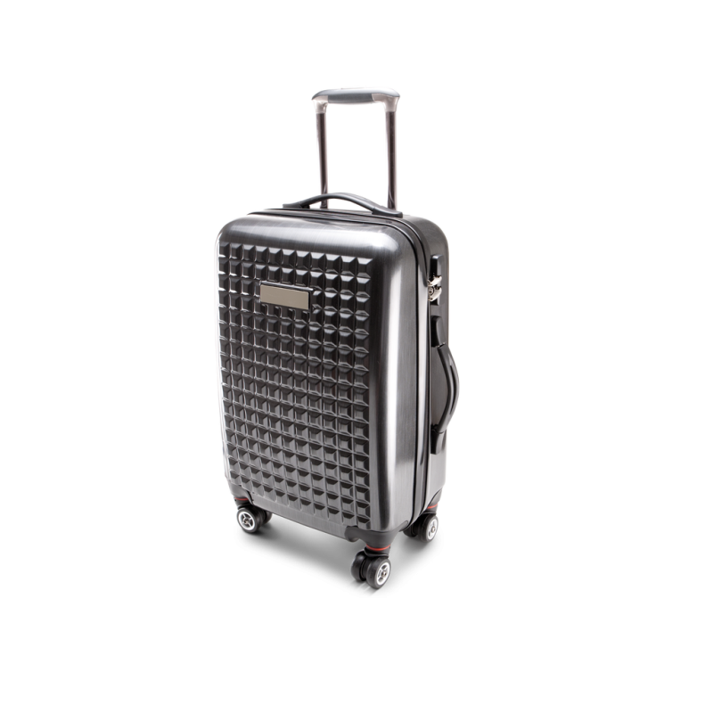 Heavy duty cabin size trolley suitcase in polycarbonate. Exclusive design. 4 double wheels. Organiser system. Side opening with secure combination lock. Removable metal plaque for easier decoration.
