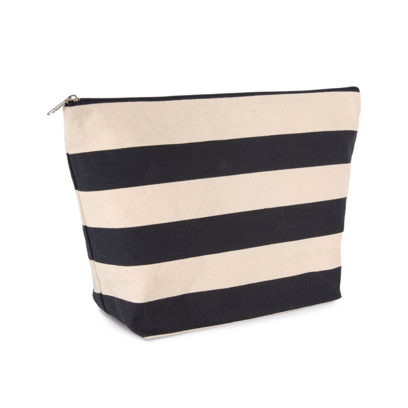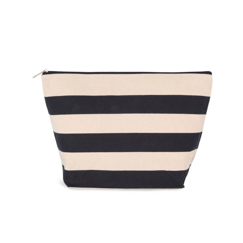 100% cotton. Extra-large pouch in a nautical look, with a wide base and zip fastening. Cotton canvas. The colour-printed strips are 3.75 cm high, making them easy to personalise, either on the coloured strip or on the natural cotton sections.