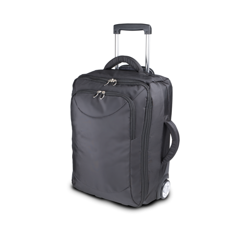 Cabin size trolley suitcase in 600D polyester. Large main compartment. Front pocket. Matching colour zip pullers. Side feet. Padded and reinforced top and side handles. The inner compartments are lined in black polyester with laces to keep clothes in place.