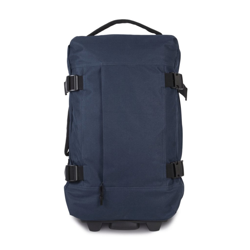 600D polyester cabin size trolley suitcase with large front zipped pocket for easy decoration access. Zipped dual inner compartments with garment straps. Retractable trolley system. Compression straps to adjust the bag's volume, base with textured protective coating and reinforced box stitching on handles.
