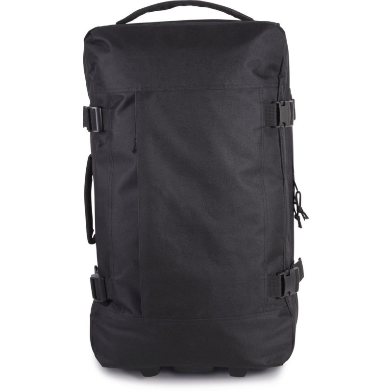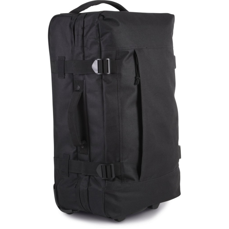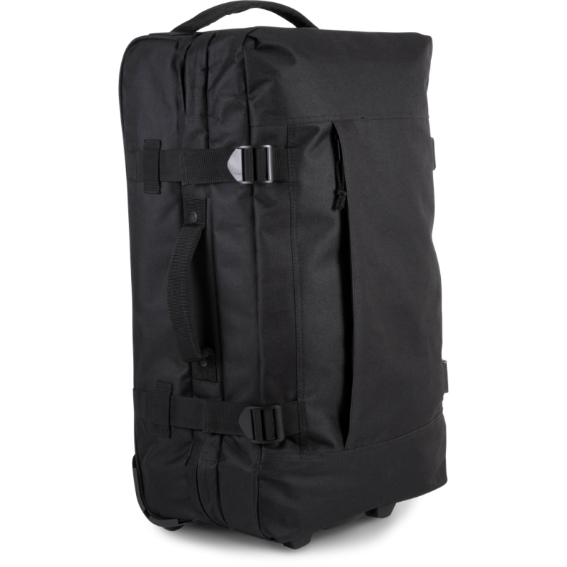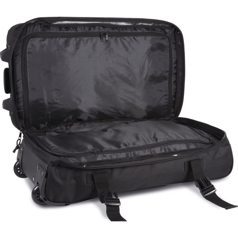 600D polyester trolley with large front zipped pocket for easy decoration access. Zipped dual inner compartments with garment straps. Retractable trolley system. Compression straps to adjust the bag's volume, base with textured protective coating and reinforced box stitching on handles.