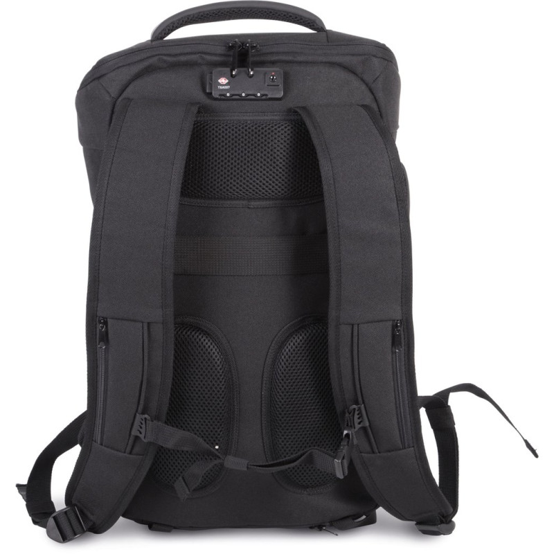 100% polyester. Of which 50% recycled polyester. 600D polyester anti-theft backpack. Reinforced cut-proof front panel. Back zip closure with TSA combination lock. Back-protected quick-access zipped pocket. Adjustable shoulder straps and sternum strap. 2 zipped pockets on the shoulder straps. 2 straps on bottom to hold jackets or sweaters. 2 side pockets. 1 side pocket with built-in USB port connected to inner power bank holder (inner micro USB cable provided). 1 side pocket with theft-preventing coiled cable to attach the backpack to table/chair leg. Inner compartment with padded laptop sleeve for laptops up to 15 inches. Padded tablet sleeve for tablets up to 11 inches. 2 mesh zipped pockets. 2 detachable zipped pouches for cables or accessories. 2 inner pockets, including 1 for bottles or flasks and 1 for storing a power bank. Integrated Rain Cover.