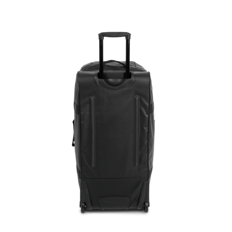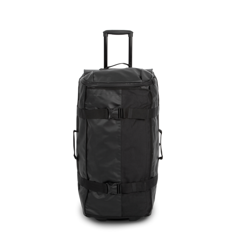100% polyester / 100% PVC. Large size trolley bag in polyvinyl chloride and polyester. With a capacity of 110 L, it is made entirely from waterproof materials with waterproof zip fastening. Practical, it consists of a shoe-storage pocket on the side, a front zipped pocket and a large inner mesh pocket for accessories with zip fastening. To make it easier to carry, it has two compression straps and handles on both sides.This sturdy bag has been designed with protective backing on the corners, a protective bar on the back of the trolley and a semi-rigid base with a plastic handle that serves as a foot.