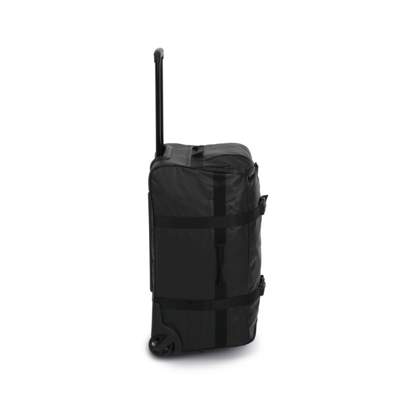 100% polyester / 100% PVC. Medium-size trolley bag in polyvinyl chloride and polyester. It is made entirely from waterproof materials with waterproof zip fastening. Practical, it consists of a shoe-storage pocket on the side, a front zipped pocket and a large inner mesh pocket for accessories with zip fastening. To make it easier to carry, it has two compression straps and handles on both sides.This sturdy bag has been designed with protective backing on the corners, a protective bar on the back of the trolley and a semi-rigid base with a plastic handle that serves as a foot.