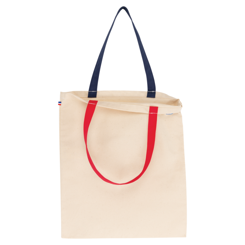 100% cotton. This bag is designed from cotton canvas. This product is made in France and is labelled as "Origine France Garantie" (Guaranteed of French Origin), produced in Brittany. A woven label with a French flag is sewn onto the side of the bag. The 2.5-cm wide and 50-cm long woven handles are in contrasting colours.