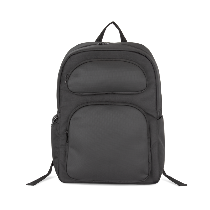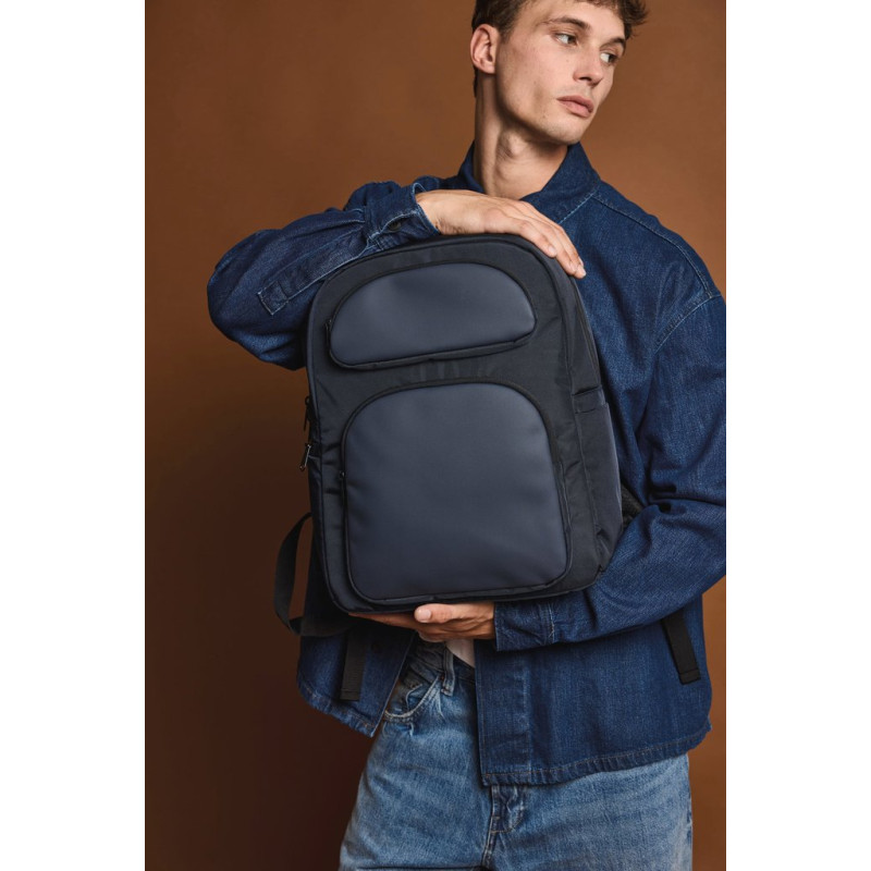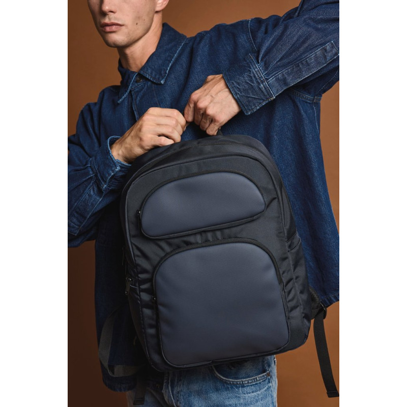 100% polyester. Backpack with double front pocket for easy customisation. Side pockets for small items. Main compartment with space for laptop and tablet. Integrated carabiner keyring. Multiple internal storage pockets, including a main zipped mesh pocket. Ergonomic, adjustable and padded straps. Padded, breathable back with trolley handle strap for easy transport. Rear security pocket for passport and phone.