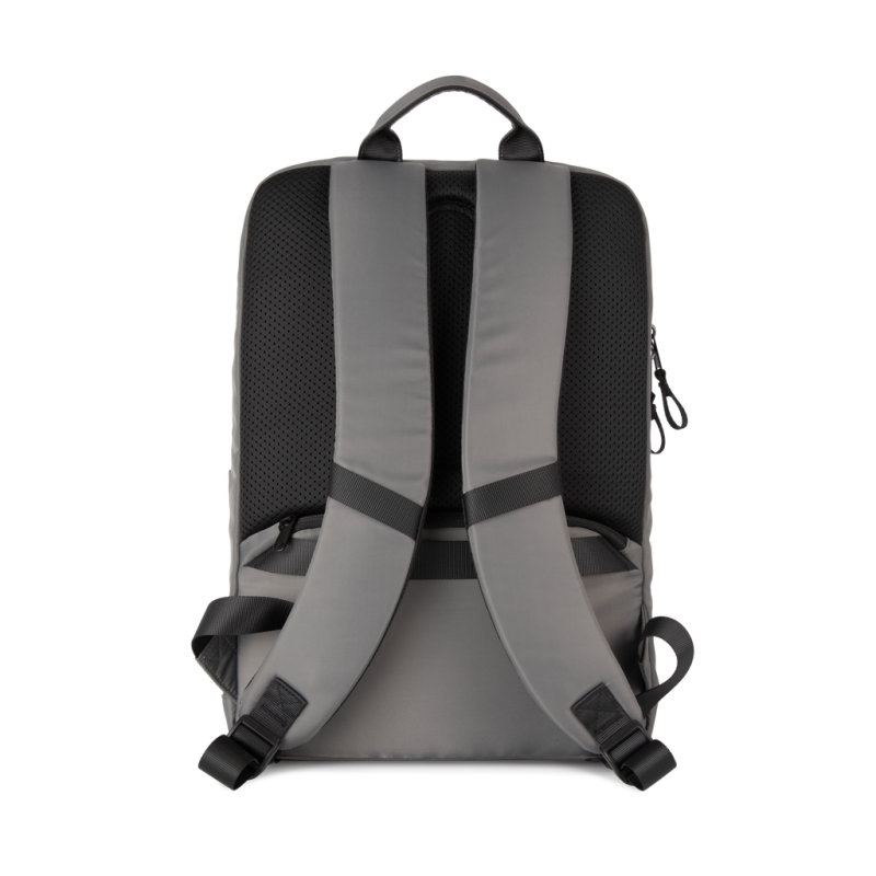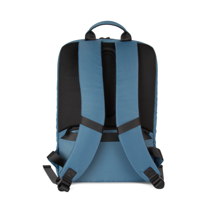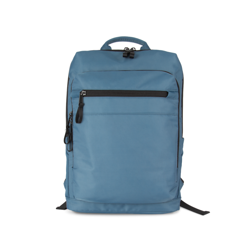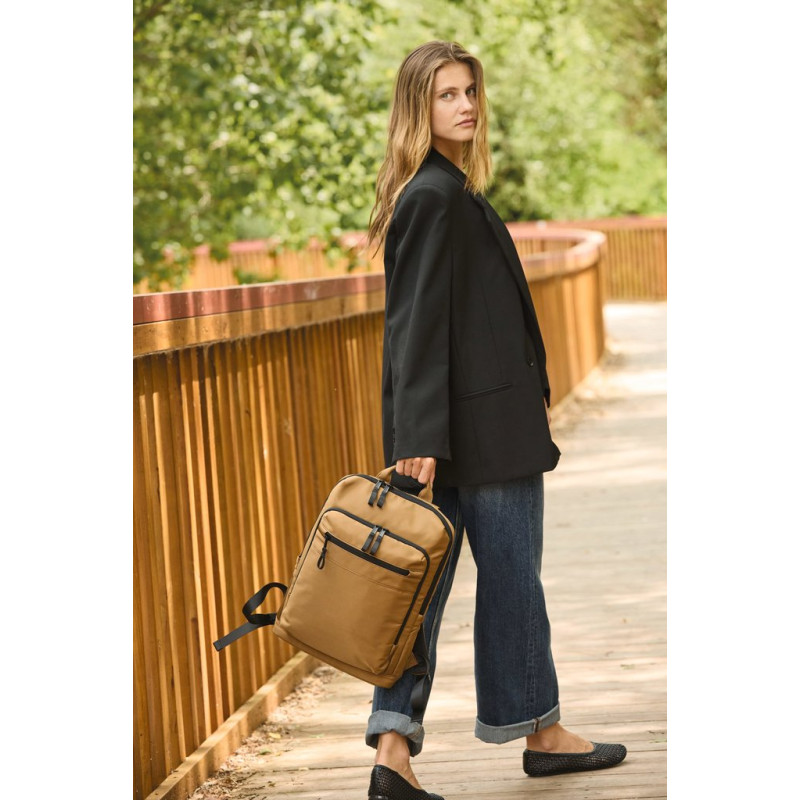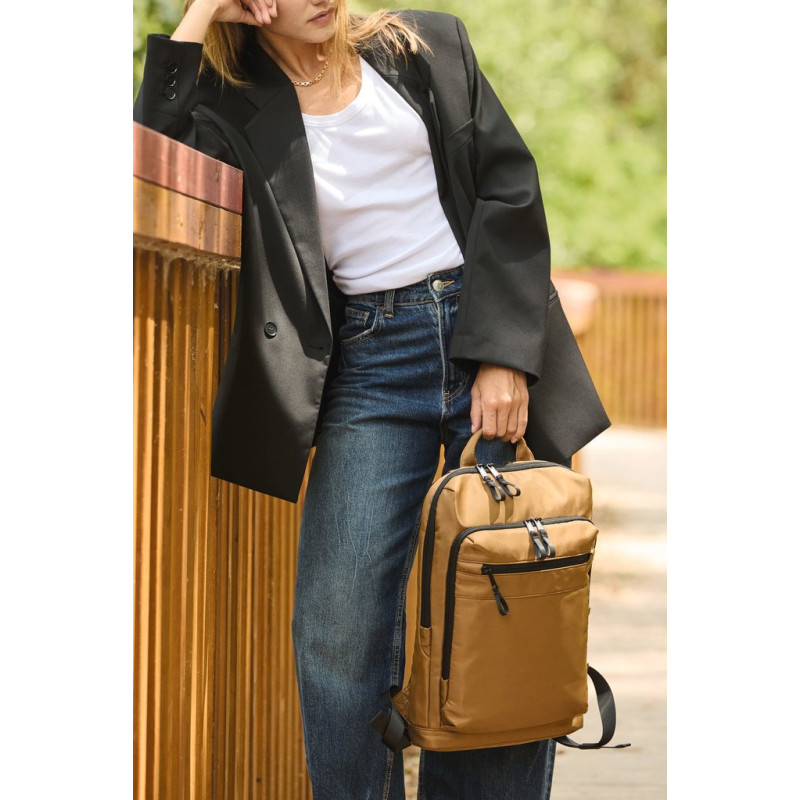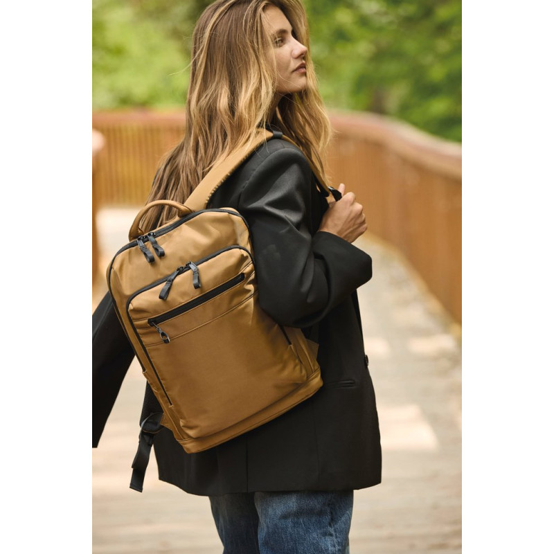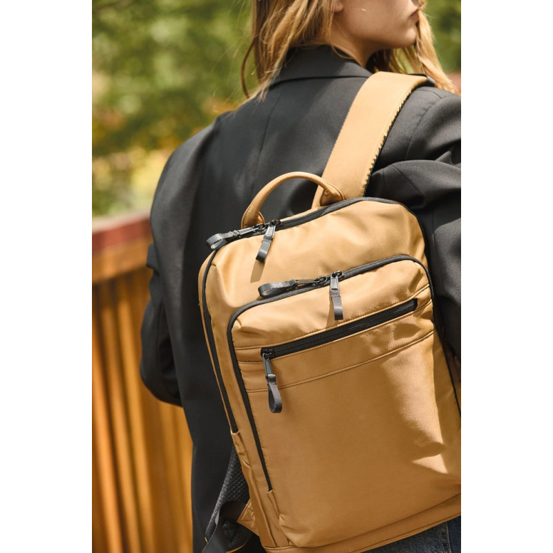 100% recycled polyester. Top-of-the-range business backpack made from recycled material. Front organiser compartment with pocket for easy customisation. Main compartment with space for laptop (up to 12 inches), tablet and documents, plus several storage pockets. Metal zip pulls with extension ring for ease of use and a modern design. Ergonomic, adjustable, padded and breathable straps. Breathable back with strap for attachment to trolley handle for easy transport. Rear security pocket with curved zip closure, in a contemporary look, ideal for safely storing passports, plane tickets and a phone.
