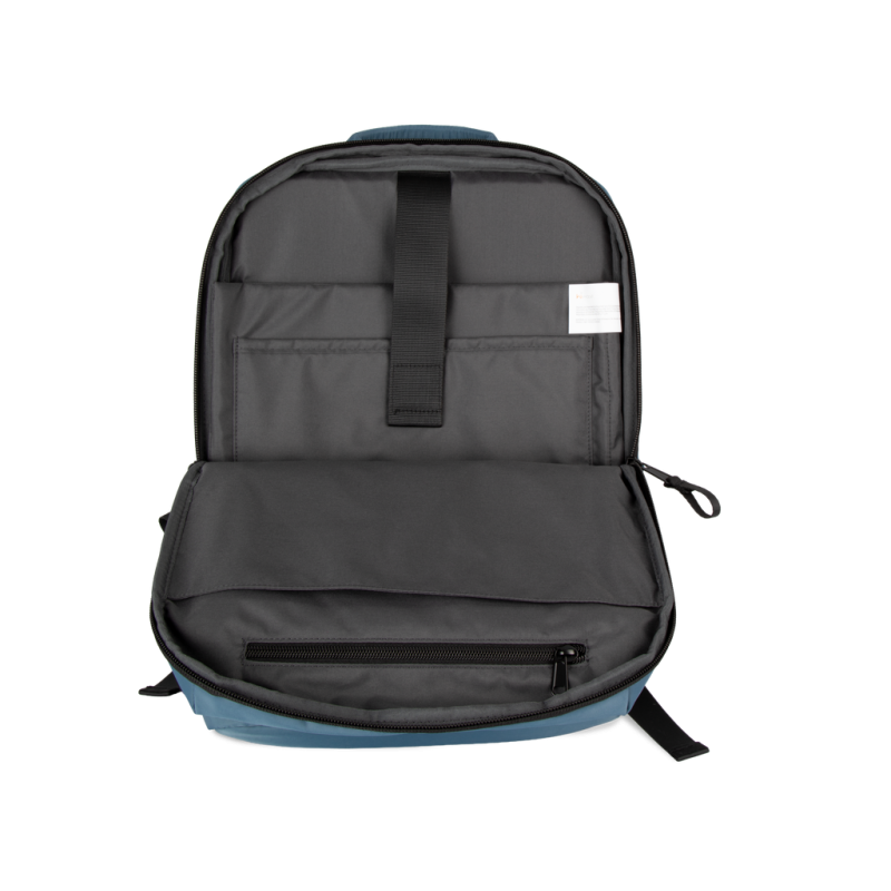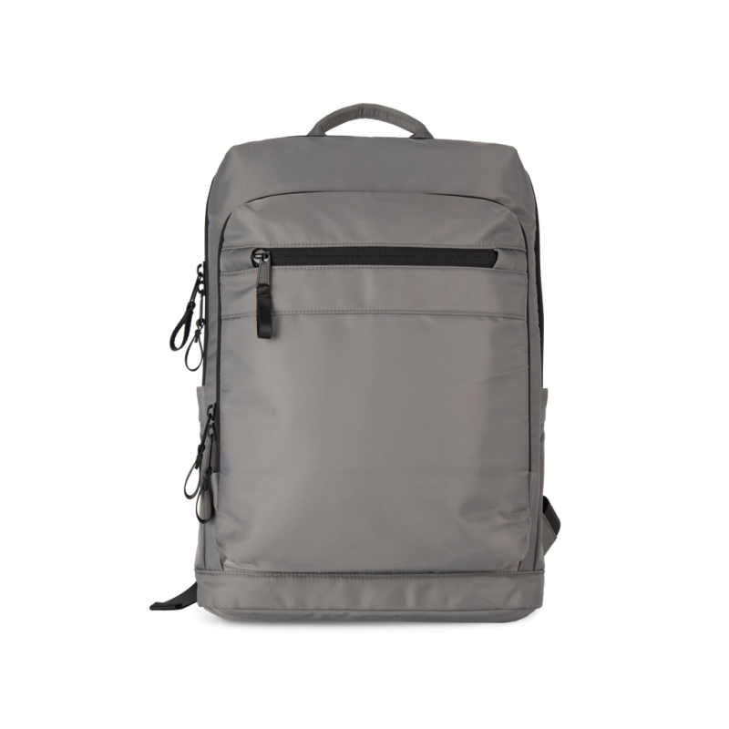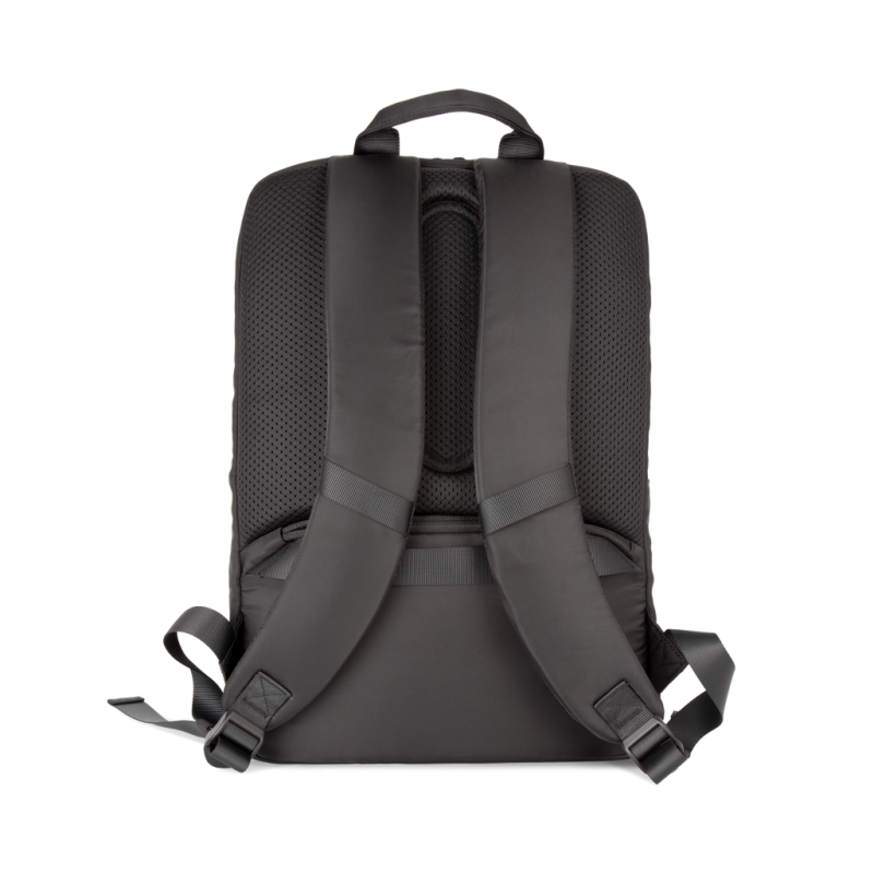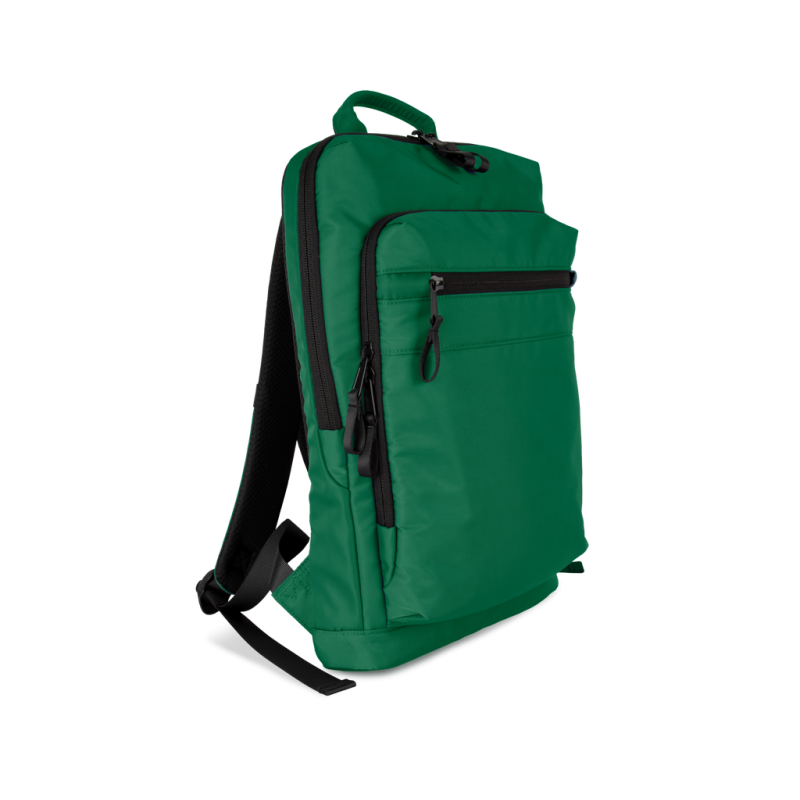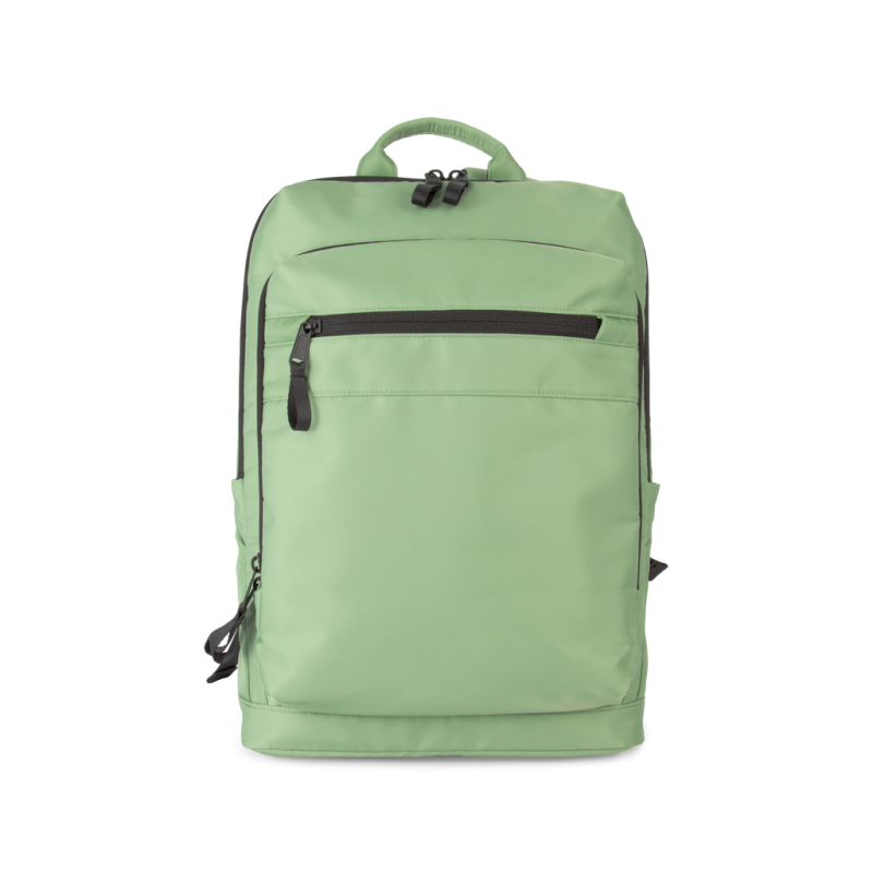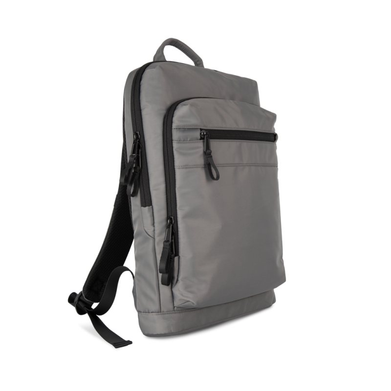 100% recycled polyester. Top-of-the-range business backpack made from recycled material. Front organiser compartment with pocket for easy customisation. Main compartment with space for laptop (up to 12 inches), tablet and documents, plus several storage pockets. Metal zip pulls with extension ring for ease of use and a modern design. Ergonomic, adjustable, padded and breathable straps. Breathable back with strap for attachment to trolley handle for easy transport. Rear security pocket with curved zip closure, in a contemporary look, ideal for safely storing passports, plane tickets and a phone.