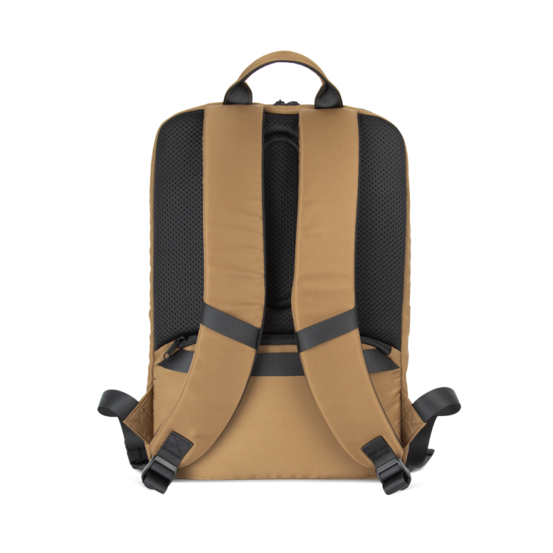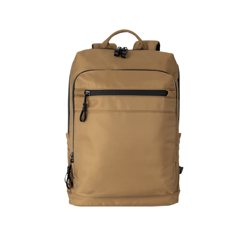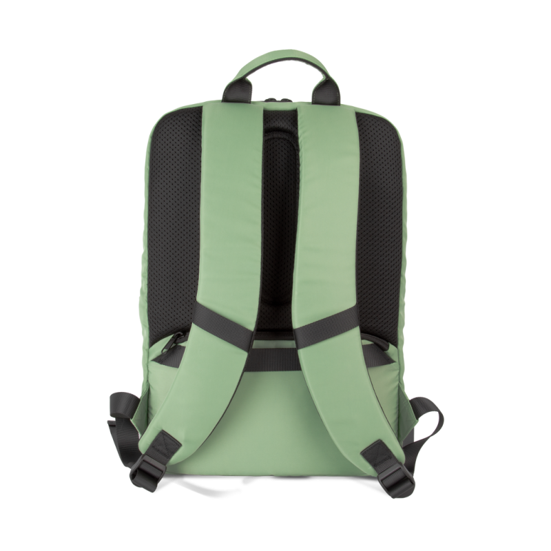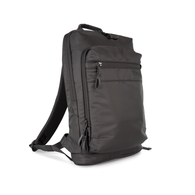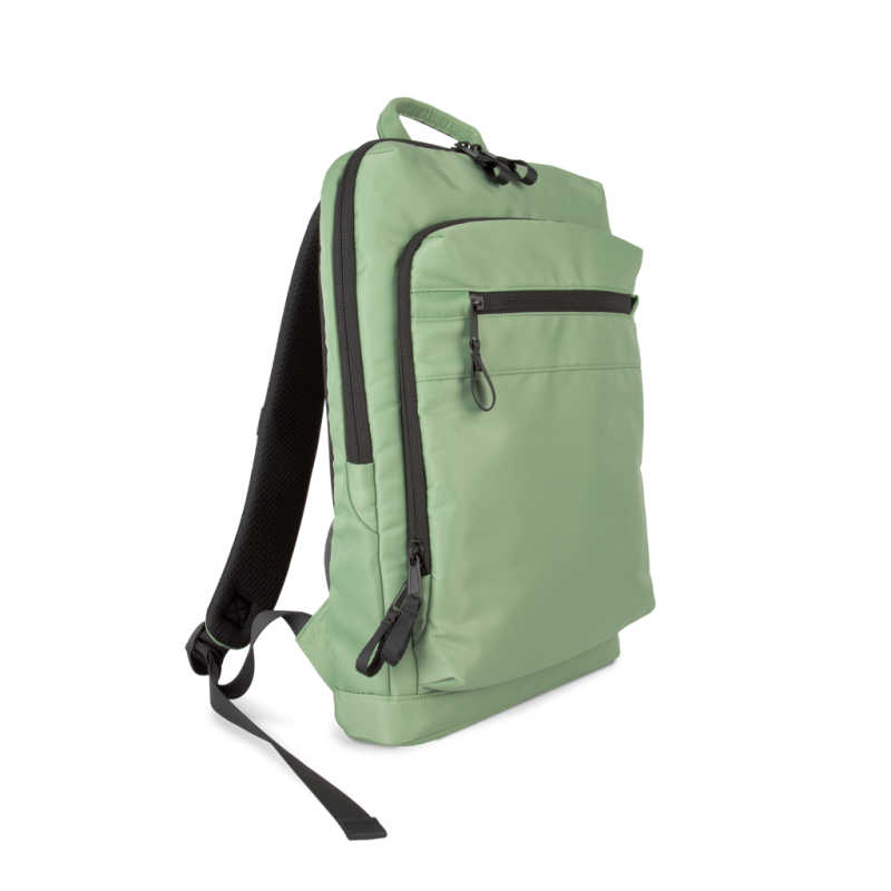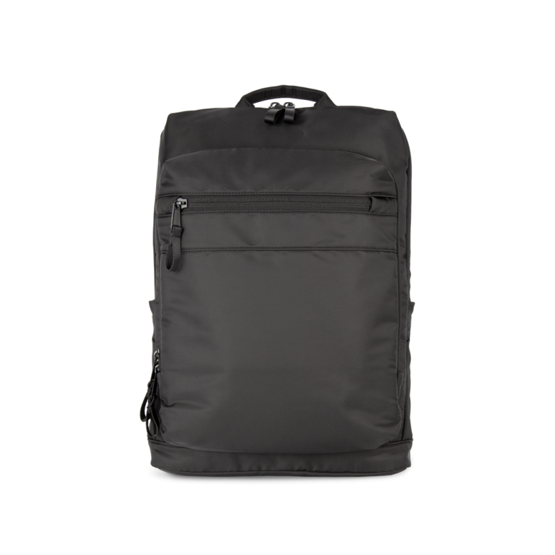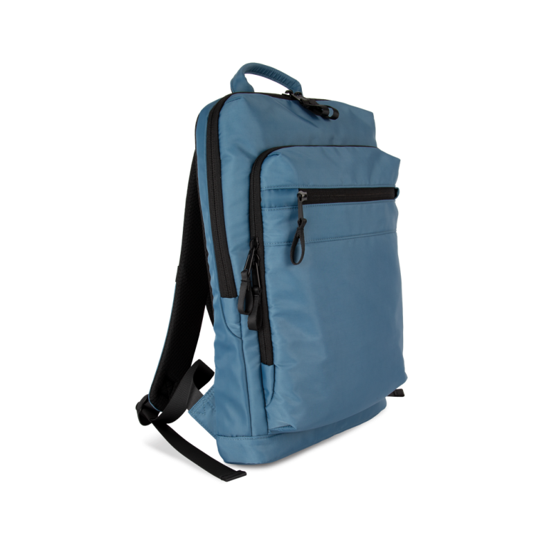 100% recycled polyester. Top-of-the-range business backpack made from recycled material. Front organiser compartment with pocket for easy customisation. Main compartment with space for laptop (up to 12 inches), tablet and documents, plus several storage pockets. Metal zip pulls with extension ring for ease of use and a modern design. Ergonomic, adjustable, padded and breathable straps. Breathable back with strap for attachment to trolley handle for easy transport. Rear security pocket with curved zip closure, in a contemporary look, ideal for safely storing passports, plane tickets and a phone.