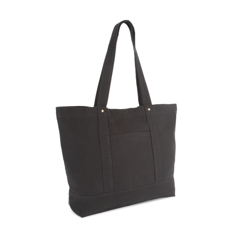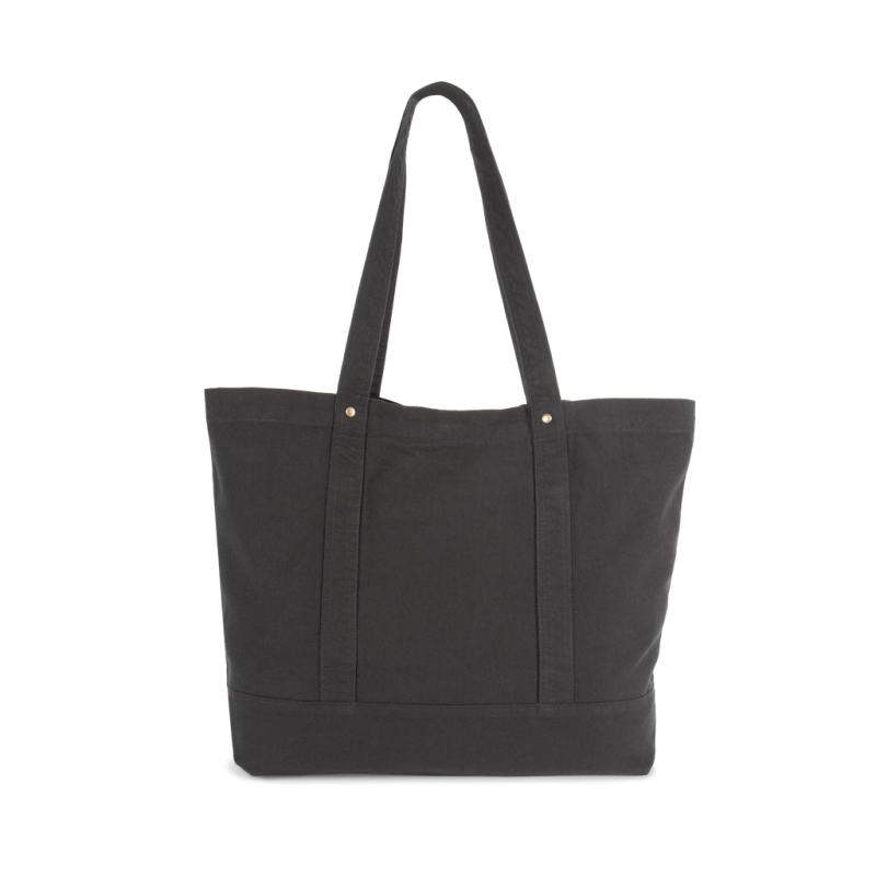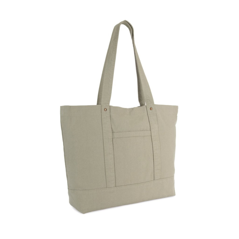 100% cotton. Large bag with wide base and gusset in faded cotton, for a vintage look. Faded products are unique and may feature slight variations in colour. Handles in the same material as the body of the bag. Decorative safety rivets between the handles and the body of the bag. Large zipped inside pocket for keys and phone. Outside pocket for easy customisation. Press stud fastening.