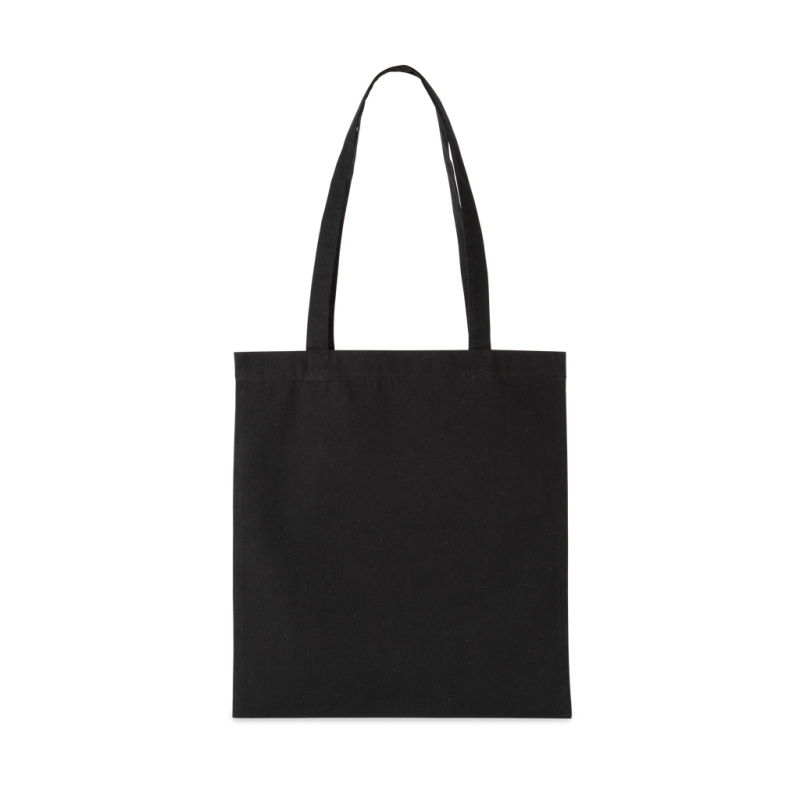 Recycled cotton / recycled polyester. Flat shopping bag with handles in the same fabric as the bag, 70 cm long. This bag is part of the “K-loop” project. With this project, Kimood is literally closing the loop of the circular economy. The cotton used comes from waste generated in the production of cotton items for the Kariban brand, and the KARIBAN BRANDS range. The added polyester comes from recycled PET plastic bottles. During the recycling process, tracers are added to the yarn in the form of viscose and ceramic filaments to act as a unique digital fingerprint. The tracers reflect light in a unique way and therefore carry a clear and tamper-proof code. This allows us to unequivocally store in a blockchain all the information from the processes the yarn has been subjected to. Thanks to the Aware™ tracer technology and associated blockchain platform, Kimood allows the end consumer to track the entire production process.This guarantees that the product has been recycled using its own waste, with no possible alterations in the process. A special label with a QR code provides access to the Aware™ platform for direct authentication of certifications using a smartphone.