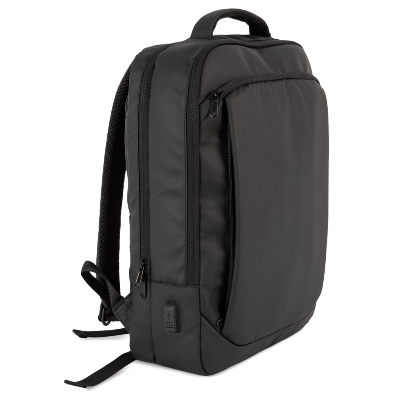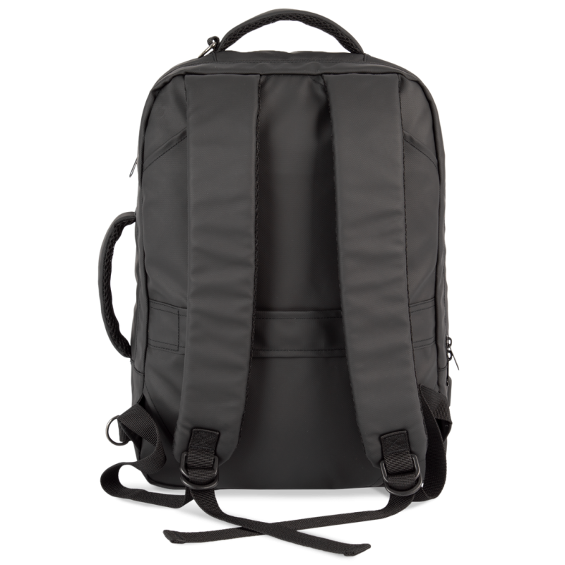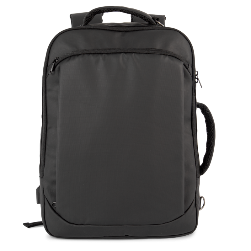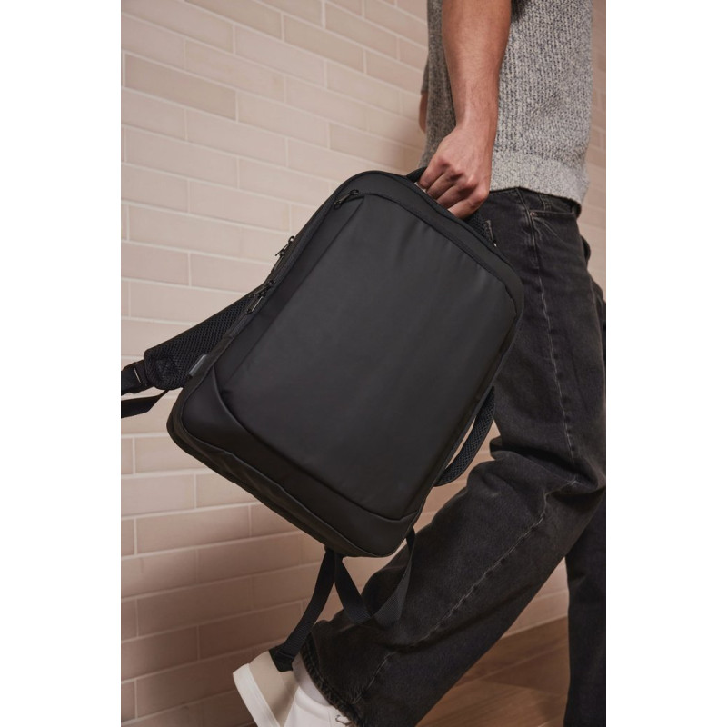 100% recycled polyester. Work backpack with padded compartment for computer (up to 15") and/or tablet. Organised main compartment and briefcase. Thanks to the removable padded straps concealed in the back, the backpack transforms into a horizontal work saddlebag with its own side handle. Large zipped top pocket. Large double front pocket with two separate openings and zipped storage compartments on right and left. External type C connector with internal cable for connecting a power bank. KIALMA is K-loop's top-of-the-range collection of bags and accessories. K-loop products contain markers in the thread and, thanks to blockchain technology, this means that the entire production chain can be traced. A special label with a QR code provides access to the Aware™ platform for direct authentication of certifications using a smartphone.