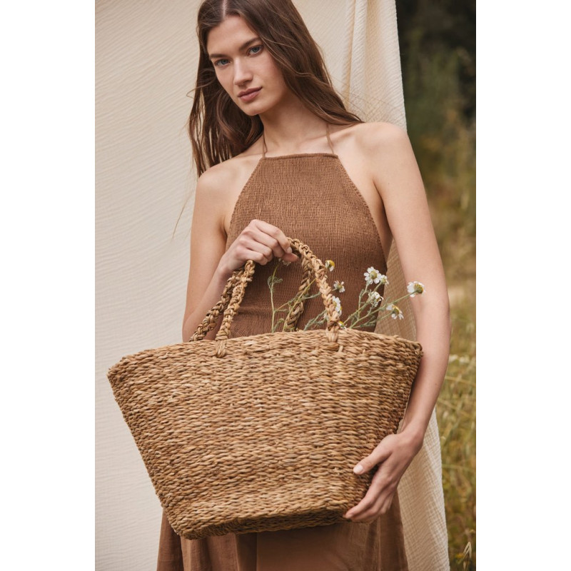 100% vegetable fibre. 70% cotton / 25% polyester (lining). Hand-woven basket made from vegetable seaweed fibre. The inner lining is hand-woven from recycled materiels (80% cotton / 20% polyester). This basket is hand-woven using traditional looms from Bangladesh, called “tant” looms. The traditional weaving gives the canvas a distinctive and unique handcrafted look. This basket is part of the "Handloom recycled project" collection that arose from a collaboration between the Kimood brand and the HandTouch company, a member of ECOTA, a fair trade organisation in Bangladesh. This item helps support the economy of families living in remote villages of Bangladesh, and the work of women in particular, thus helping to prevent these villages from being deserted. There is a label inside the bag with details about the project and there is also a space for decoration to add logos and/or messages.