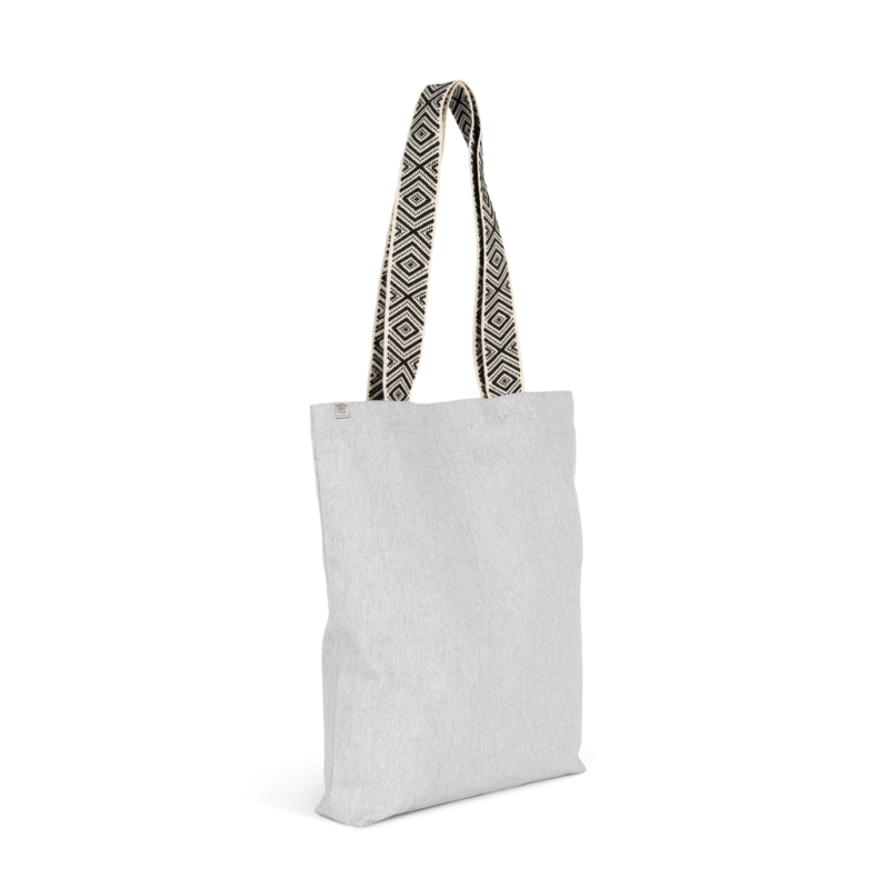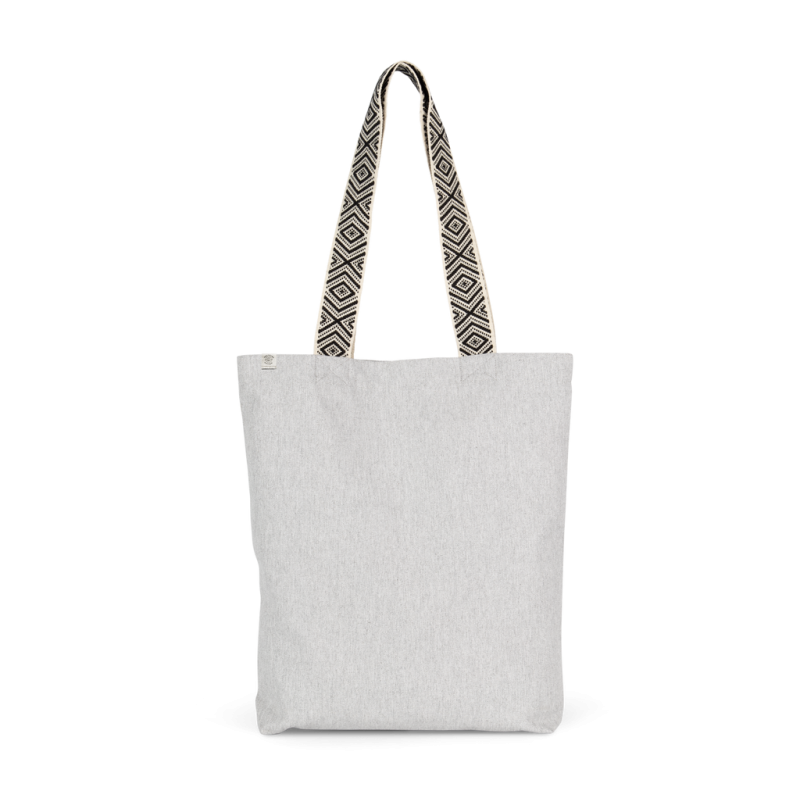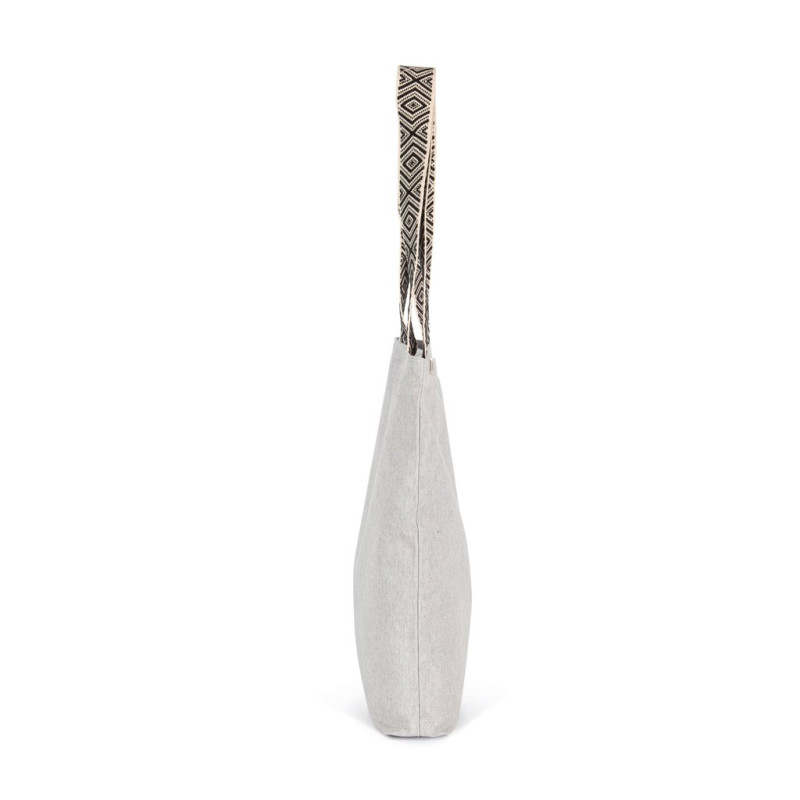 Recycled cotton / recycled polyester. 75% recycled cotton / 22% recycled polyester / 3% other fibers (Pebble grey), 73% recycled cotton / 25% recycled polyester / 2% other fibers (Ecume / Ethnic Blue), 67% recycled cotton / 30% recycled polyester / 3% other fibers (Ecume / Ethnic Red). The contrasting coloured handles feature ethnic inspired graphics and are 60 cm long and 4,25 cm wide for extra comfort. Comes with cardboard hangtag listing the eco-friendly materials used to make the product. Organic cotton thread.