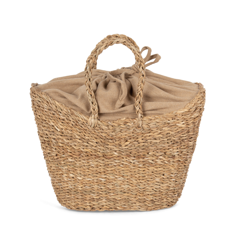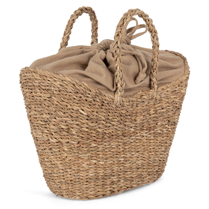 100 % seagrass. Capacity: 19 L. This product is hand woven from seagrass plant fibres. Hemp-coloured inner lining in cyclo thread made from 70% recycled cotton, 28% recycled polyester and 2% other materials. Fastens with a drawstring tie. Round braided handles. This basket is the result of a collaboration with the company HandTouch, member of ECOTA: national fair trade network in Bangladesh contributing to a more sustainable economy.