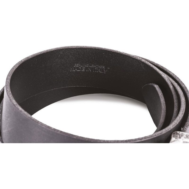 100% leather. Full grain cowhide split leather with aniline finish. Raw edge belt made in Italy. Thickness : 35 mm. Total length : 125 cm. Can be adjusted to fit sizes XS to XXL by shortening the belt length since the buckle is detachable. Supplied in a cotton bag for easy decoration.
