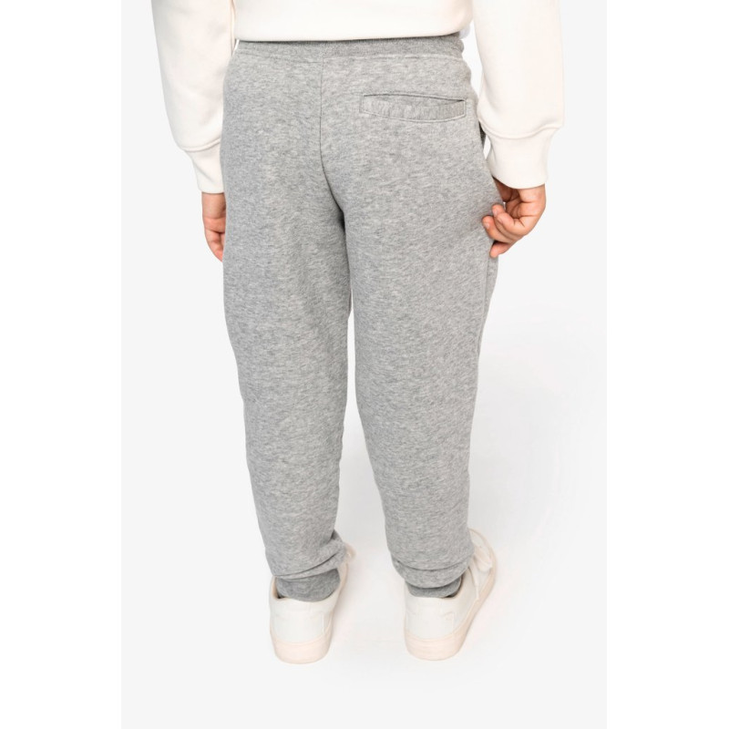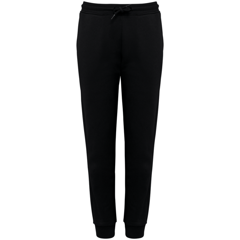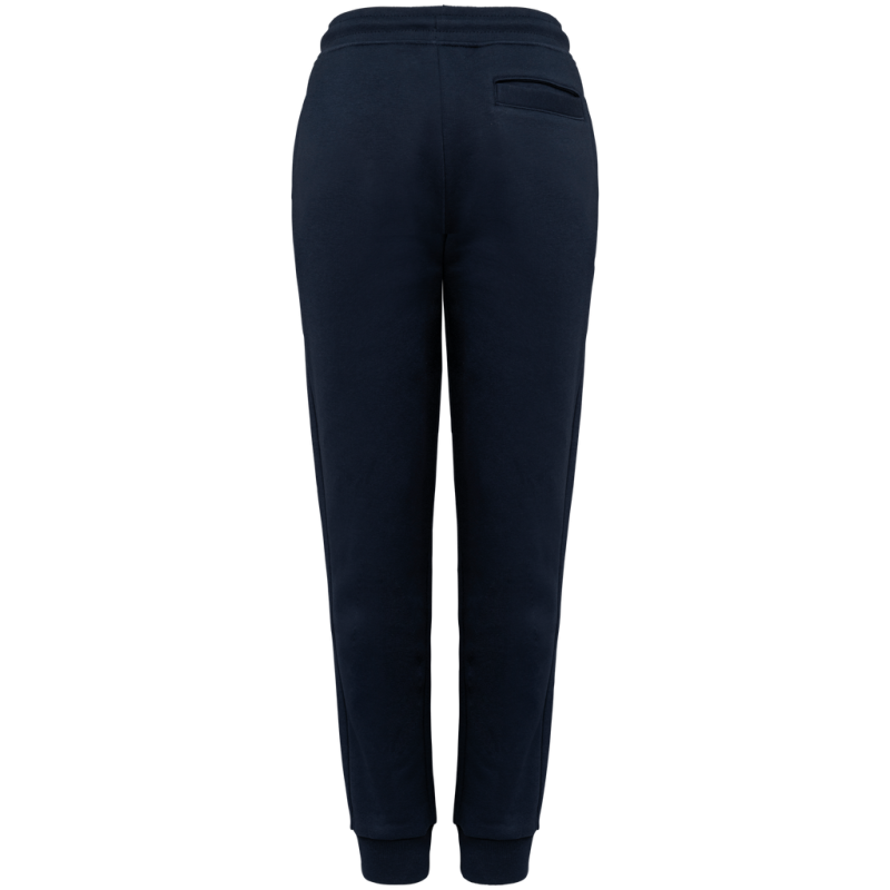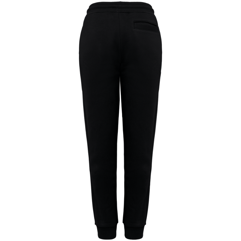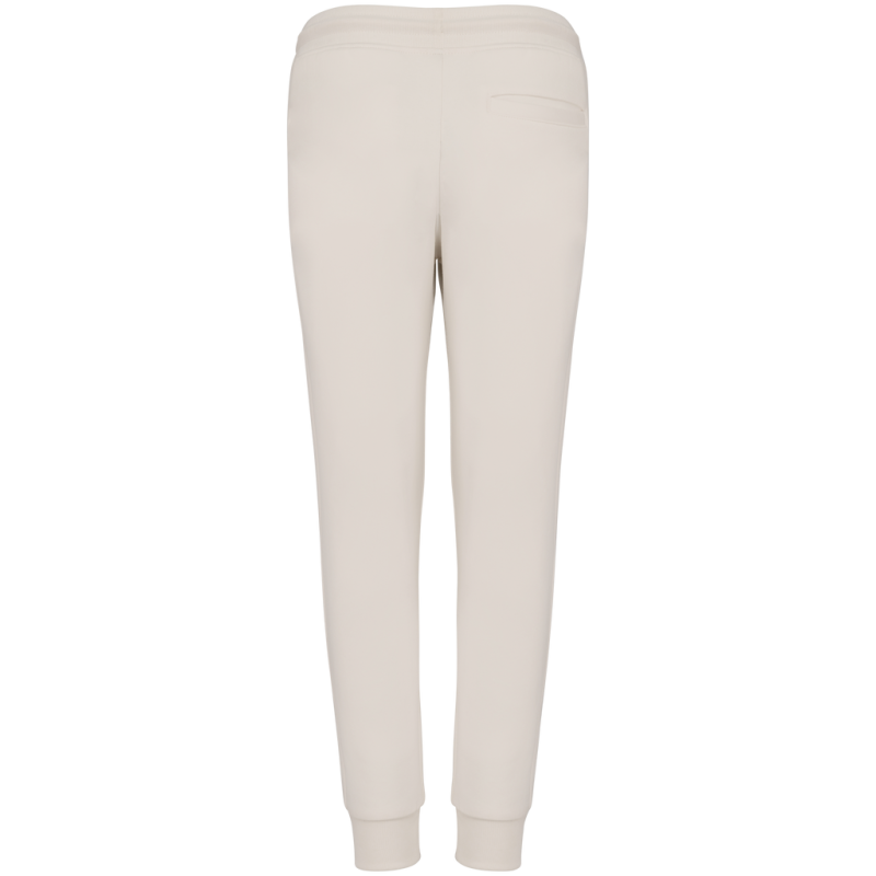 85% organic cotton / 15% post-consumer recycled polyester. Combed cotton. 3-ply brushed fleece LSF (Low Shrinkage Fleece: pre-shrunk fleece). Enzyme-washed. Elasticated waistband in 1 x 1 ribbing with round drawstring made from organic cotton. Buttonhole eyelet for waistband drawstring. Side pockets and one back pocket with piping. 1 x 1 rib leg hem.
