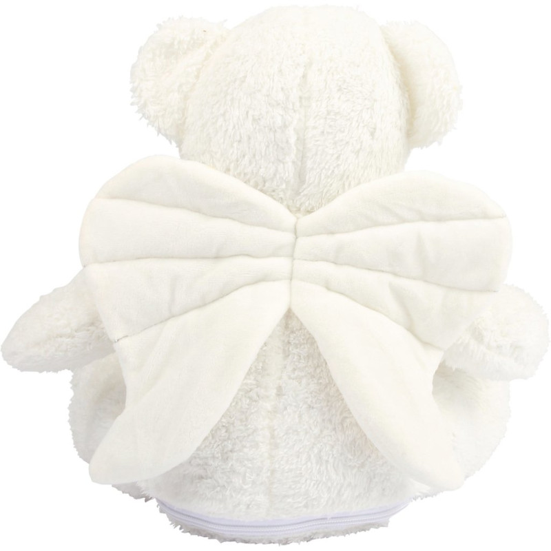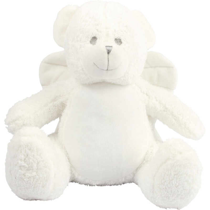 100% polyester plush. Contrast eyes and nose. Cream fabric wings. Cream coloured panel on tummy. Zip access on base for direct access onto the tummy for decoration. Removable inner stuffing. Can be embroidered, vinyl or sublimation printed. Height: 42 cm. Complies with EN71 European Toy Safety regulations. Suitable for all ages.