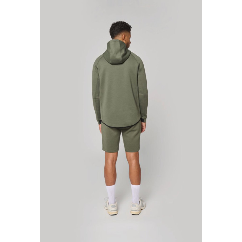 Plain colourways: 94% polyester/6% elastane. Marl colourways: 79% polyester/15% viscose/6% elastane. Extremely comfortable fabric. Elasticated waistband with two-tone drawstring with plastic tip and metal eyelets. 2 lined jersey front pockets and 1 zipped back pocket, contrasting heat-sealed finish. Pockets finished with a contrasting elasticated section: Black on all colourways and Dark Grey on the Black and Ash Heather. Twin needle finishing at hem. Tear-away brand label.