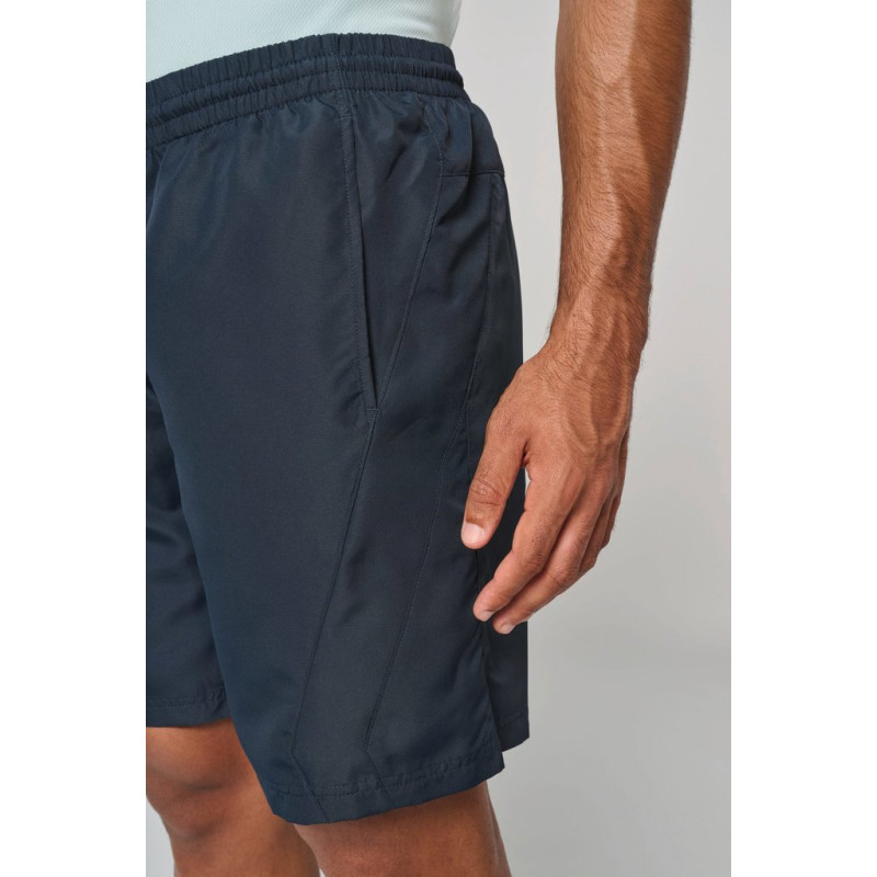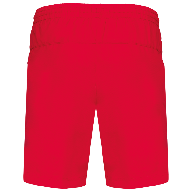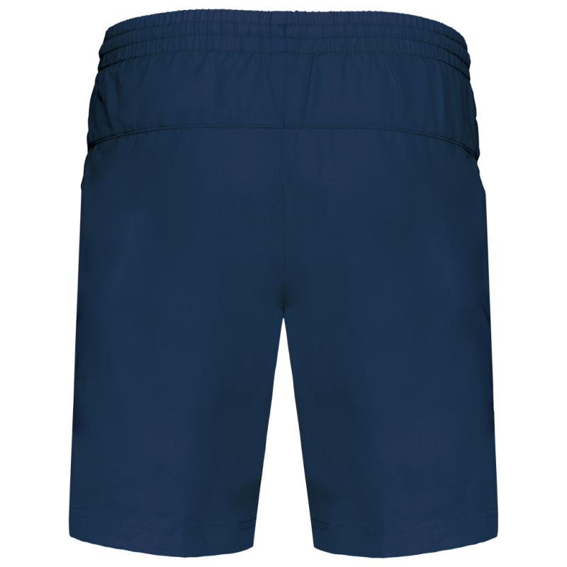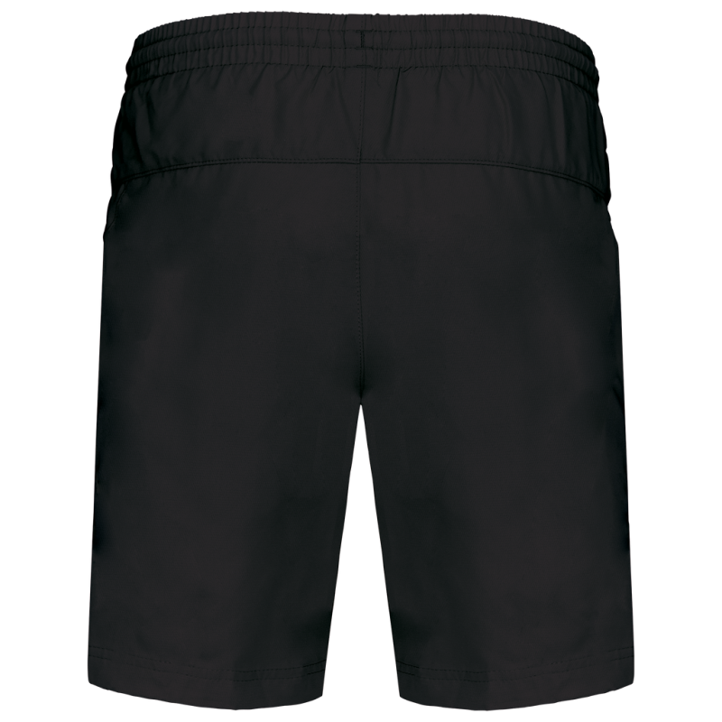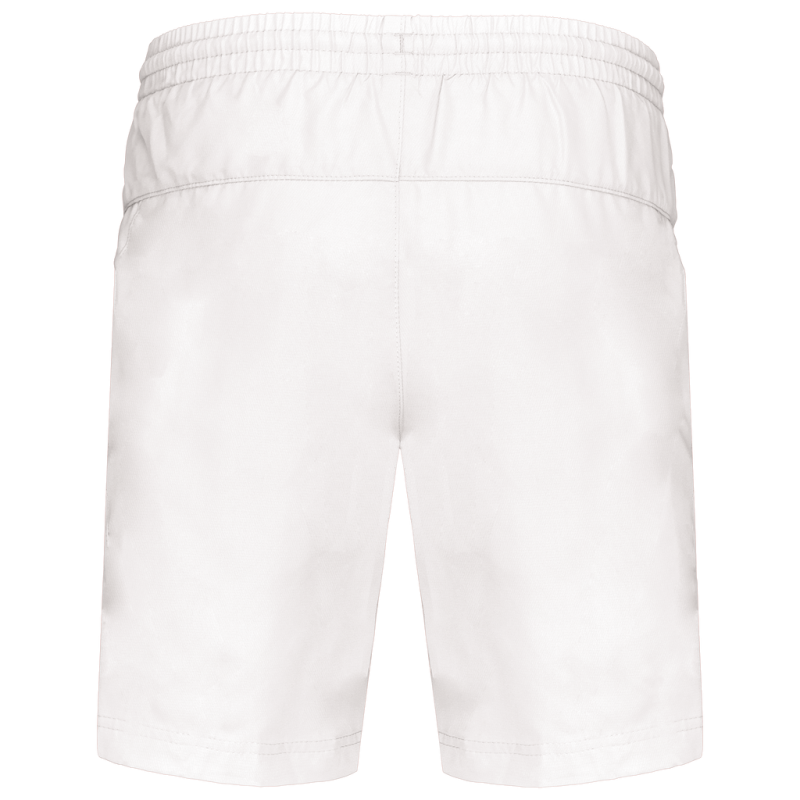 100% polyester. Quick-drying fabric. 2 side pockets. Elasticated waist with drawcord. Built-in mesh underwear. Matching trim on sides.