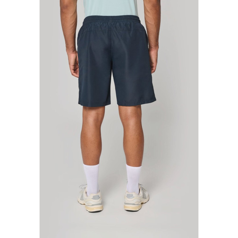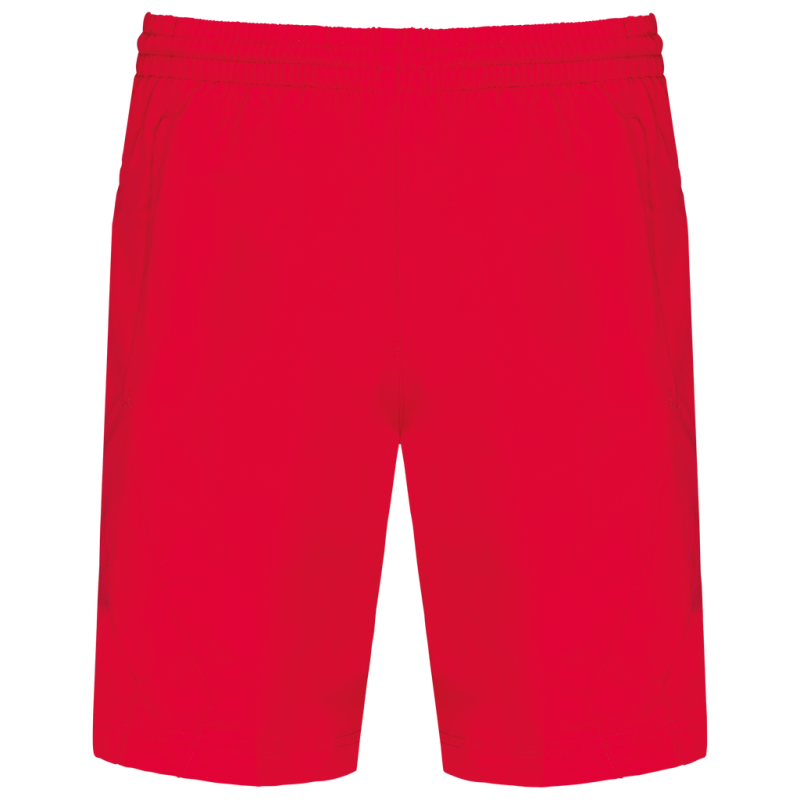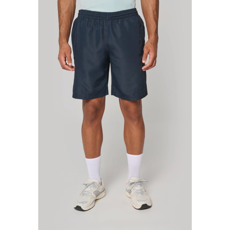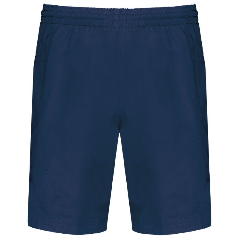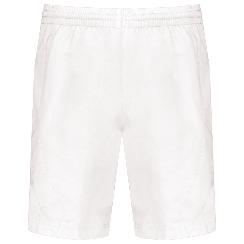 100% polyester. Quick-drying fabric. 2 side pockets. Elasticated waist with drawcord. Built-in mesh underwear. Matching trim on sides.