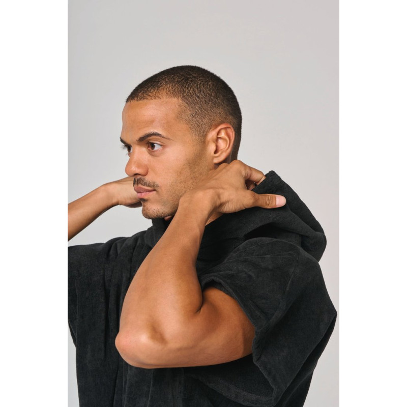 100% cotton. Made from 100% organic cotton. Terry fabric. Front crossed hood. Large open central pocket inside garment. 2 side openings at mid-height to facilitate dressing and undressing. 2 side slits with reinforced seams. Half-moon finish at the neckline to facilitate decoration access inside. Tear-away brand label.