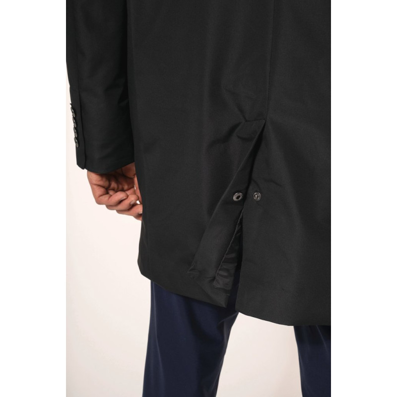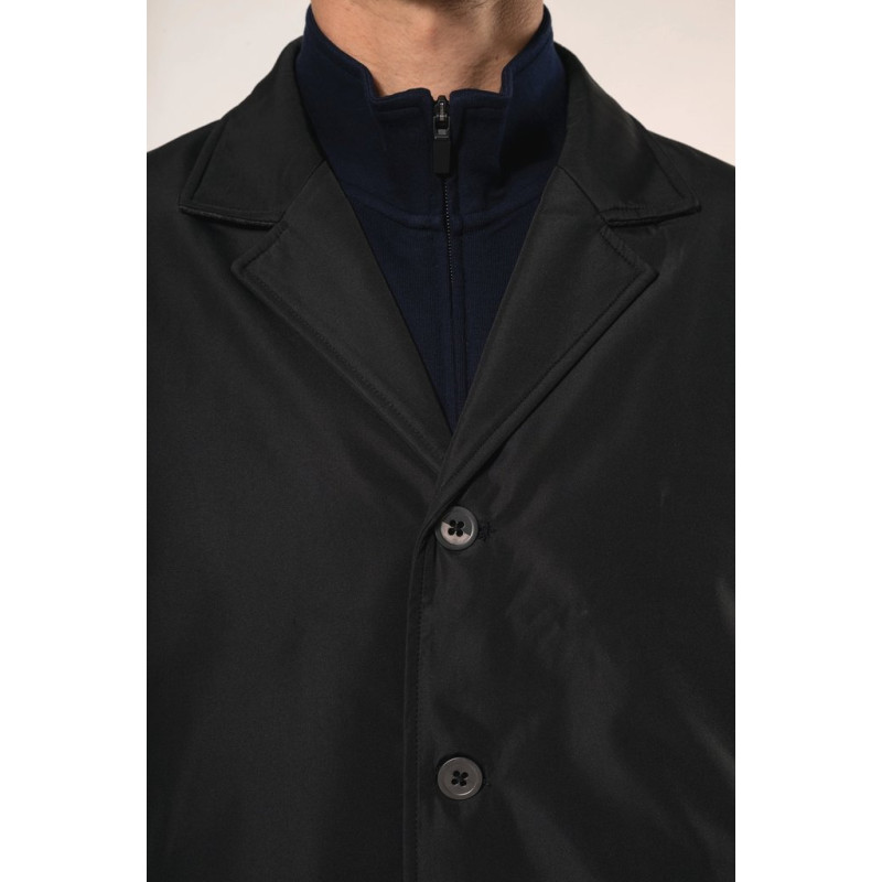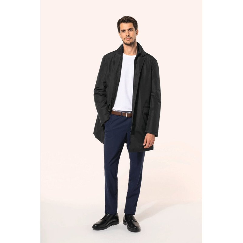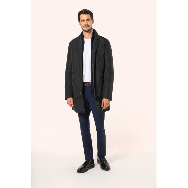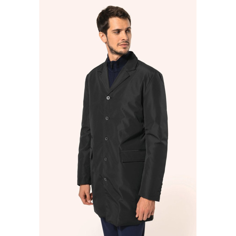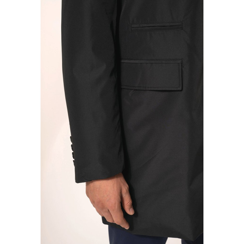 100% polyester. 3 bonded layers. Waterproof fabric 8,000 mm. Inner Thinsulate® padding. Wind breaker. Tailored collar with contrasting felt collar inner. Metal button fastening at the front. Metal buttons at cuffs. 2 flap pockets at the front and 1 piped pocket on the right. Inside zipped pocket on left. Back hem slit with press stud. Hanging loop at neckline. Inner personalisation zip at rear hem and left-hand side. Personalisation patch at top of back. No brand label, only size tag for easy decoration access.