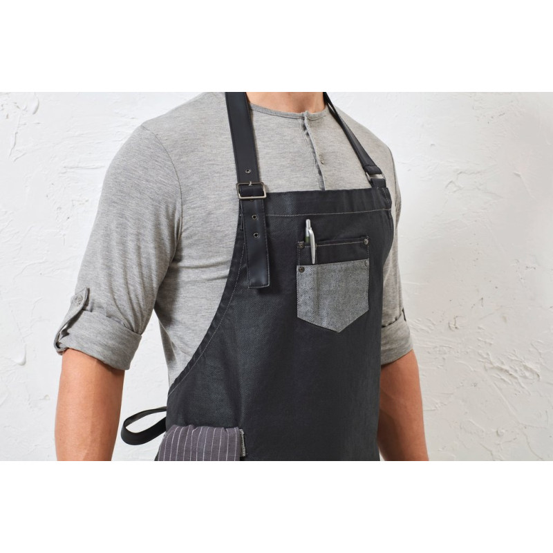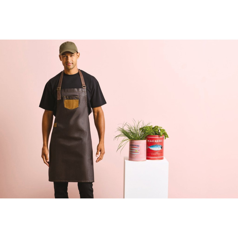 100% cotton denim with durable acrylic waxed effect finish. Tinted denim effect created by contrast coloured yarns. A bib apron with rustic charm featuring contrast fabric features and faux leather details for an authentic and luxurious appearance, popular with many establishments. Faux leather ties. Neckband with adjustable buckle. Length: 86 cm. Width: 72 cm.