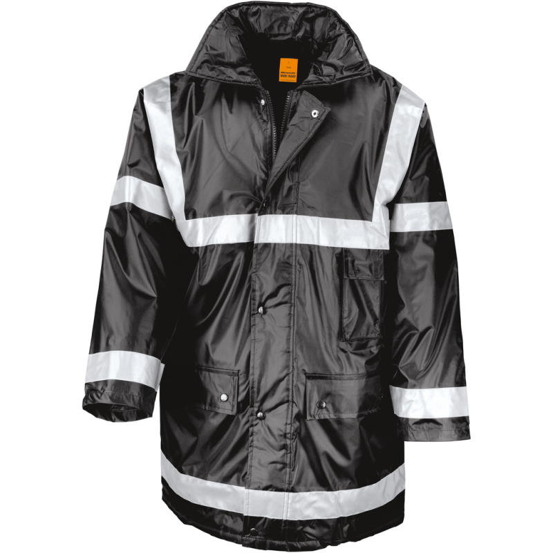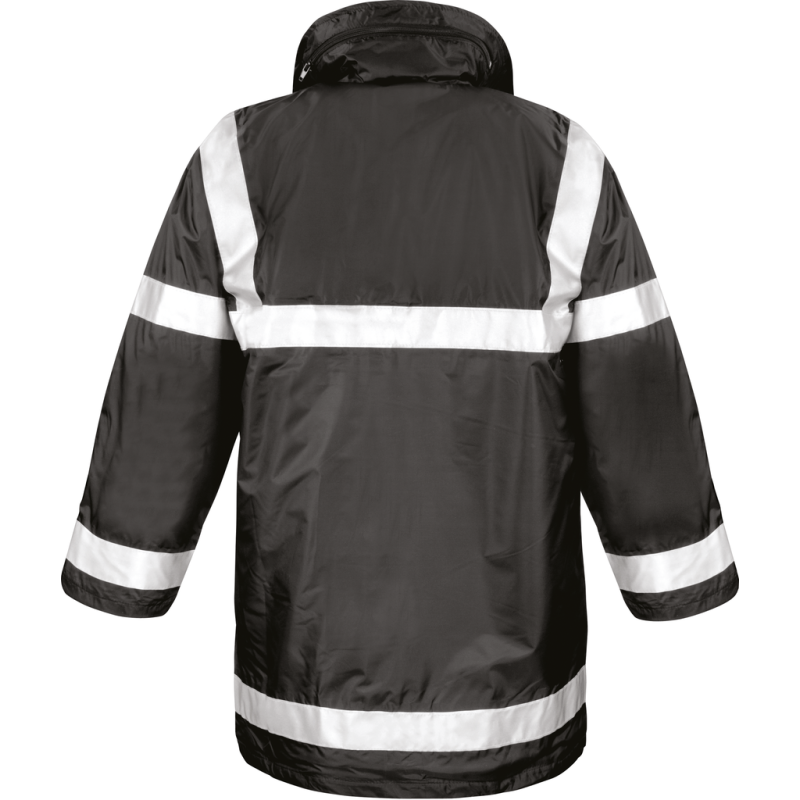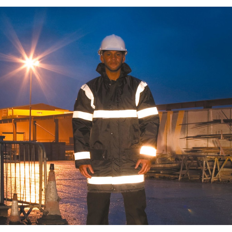 190T Polyester StormDri with PVC Coating. Filling- 140g/m2 Polyester. Lining- 190T diamond quilted Polyester. Waterproof (1600mm). Taped seams. Concealed hood in collar. Quilted. Stud closing storm flap. 50mm sewn on safety tapes. 2 front press stud pockets. 1 outer phone pocket. 1 inner pocket. Opening at the back for easy decoration access.