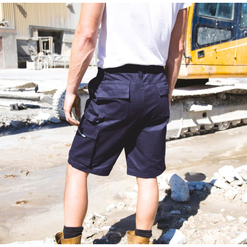 65% polyester/35% cotton. Windproof shorts. Adjustable waist with front zip with button fastening. Belt loops. Twin needle stitched seams. Multi-pockets: large side pockets with reflective piping, cargo pockets with Velcro® piping, rear pockets, phone pocket, tape measure pocket, 2 deep side pockets, hammer loop.