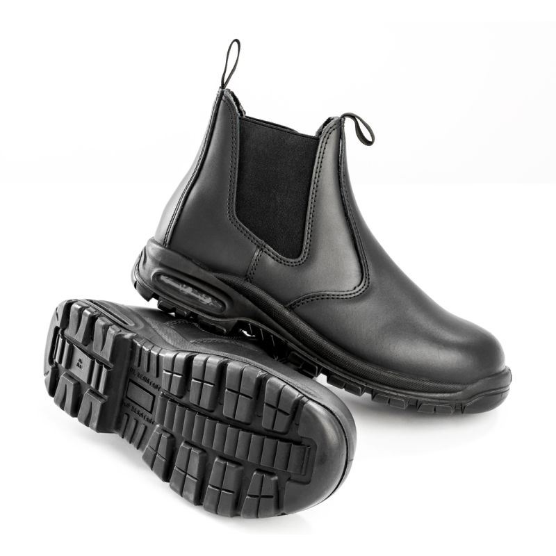 Upper: leather with elasticated inserts at the side. Sole: double-density polyurethane. Midsole: steel. Steel toe cap. Mesh inner with light padding. Shock-absorbent heels with air cushioning in the heels. Side ventilation panels. Oil-resistant. “Shoehorn” rear tabs. Lightweight. CE EN 20345:2011 S3 SRC.